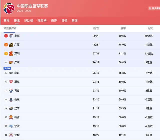首先排在前五名的球队是上海、广厦、深圳、广东以及北京队。前五的排名实际上对比前面几天的变化并不是特别的大。因为目前随着第二阶段的比赛即将收官,所以各大球队的成绩已经开始趋于稳定。而目前来看,上海男篮凭借着十九连胜,已经提前锁定了本赛季的常规赛冠军。对于上海男篮来说,本赛季拥有这么好的成绩是一件值得兴奋的事情,也意味着季后赛他们有很大的概率可以进入决赛冲击冠军。