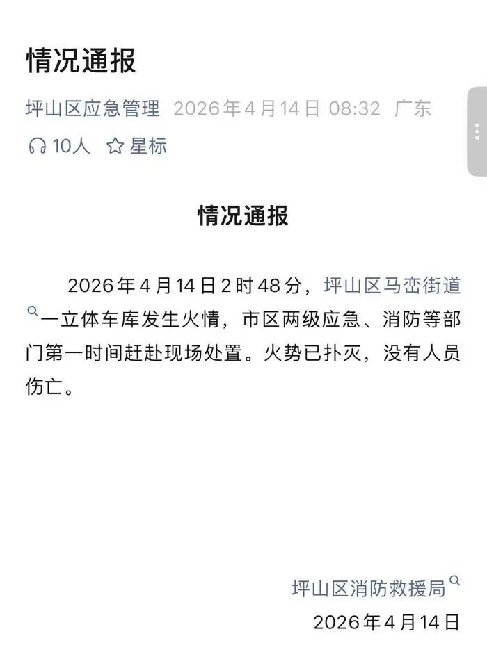 2026年4月14日凌晨,深圳坪山区马峦街道传出火情,一处立体车库突发意外火情,引发多方关注,事发后的应急处置与现场情况也陆续公布。