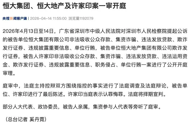 2026年4月13日至14日,广东省深圳市中级人民法院依法公开开庭审理了恒大集团有限公司、恒大地产集团有限公司及该公司创始人许家印涉嫌一系列违法犯罪案件。本案由深圳市人民检察院提起公诉,受到社会广泛关注。