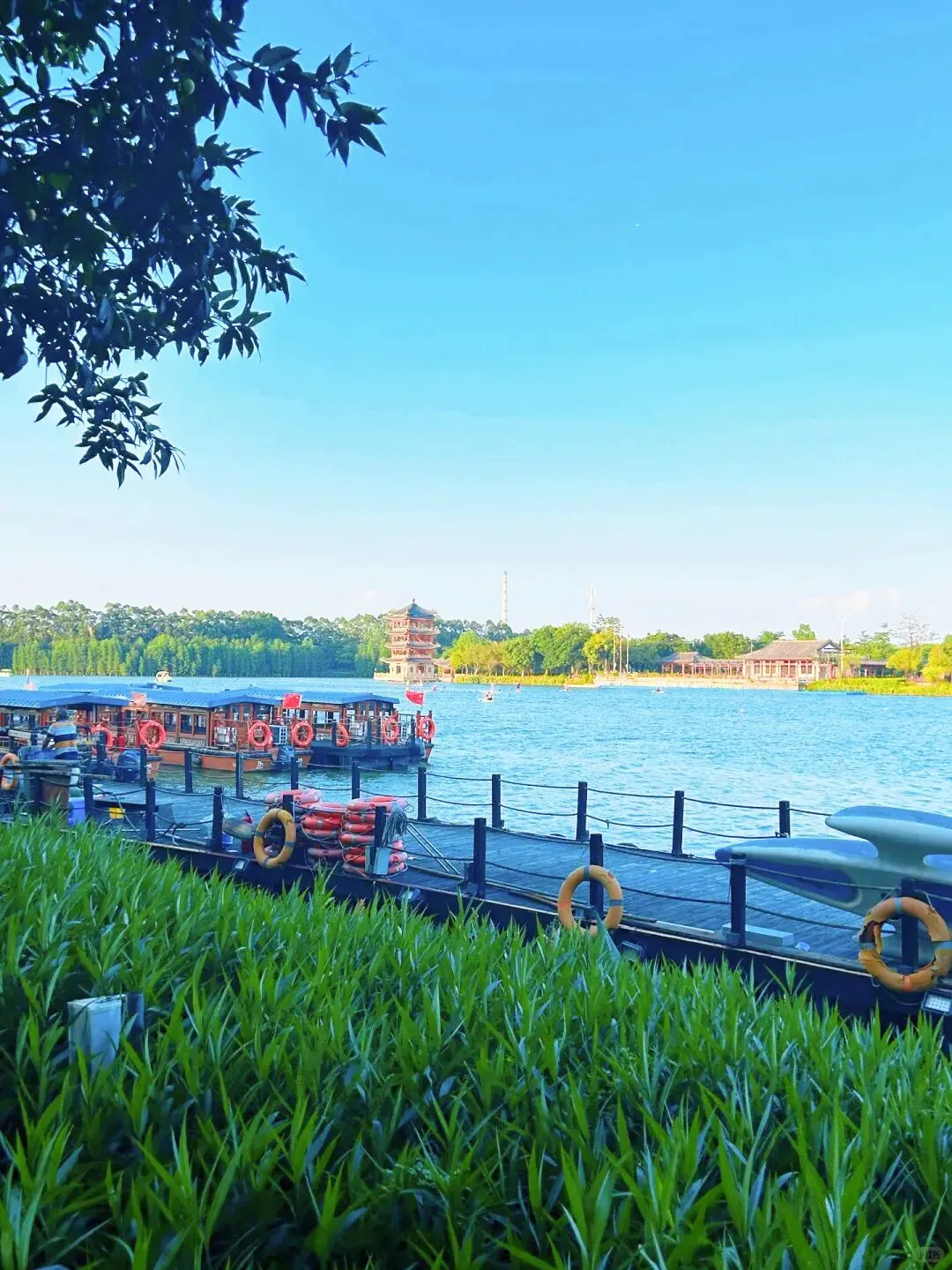 在华阳湖骑行,像闯入了一幅灵动画卷,树荫凉快,微风裹着草木香拂面,骑行道平坦舒适,一路皆是风景。