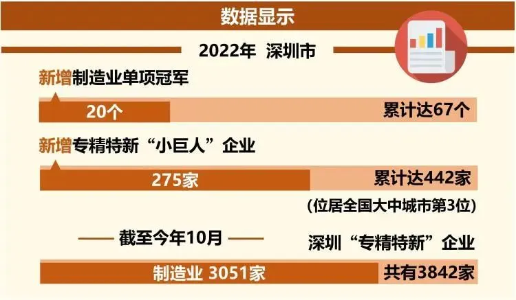 一批专精特新企业竞相涌现。数据显示,2022年,深圳市新增制造业单项冠军20个,累计达67个,位于全国大中城市前列;新增专精特新“小巨人”企业275家,新增数量居全国大中城市第2位;总数达442家,位居全国大中城市第3位。截至2022年10月,深圳“专精特新”企业共有3842家,其中制造业最多,达3051家。