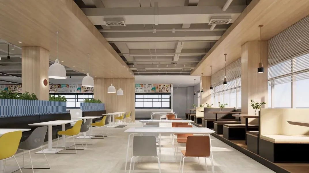 8000㎡五层食堂,营养师定制科学食谱,涵盖各地风味,设学习讨论区,兼顾营养与交流需求。
