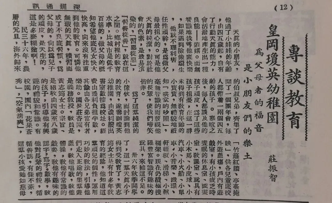 皇冈琼英幼稚园。在皇冈。当时宝安县(即今深圳市)是粤语行文,称“幼稚园”而不称“幼儿园”。你没看错,民国时期深圳已有幼儿园。