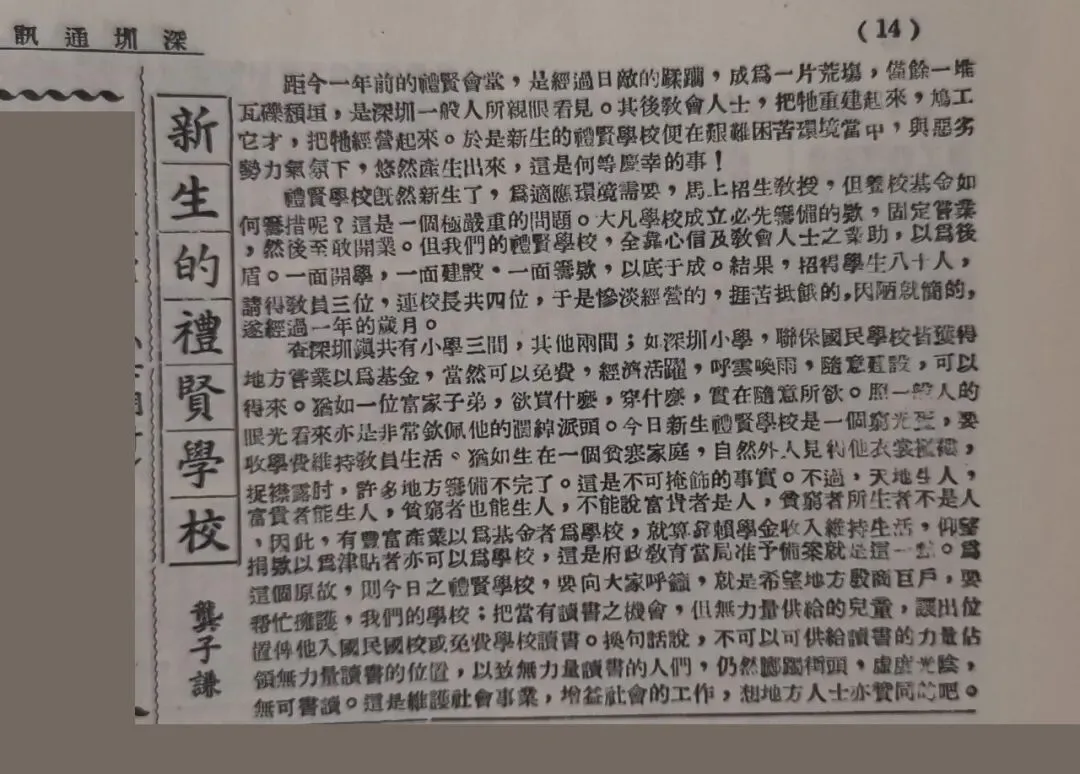 共有小学三间。其他两间:如深圳小学、联保国民学校,皆获得地方营业以为基金,当然可以免费……今日新生礼贤学校是一个穷光蛋,要收学费维持教员生活……