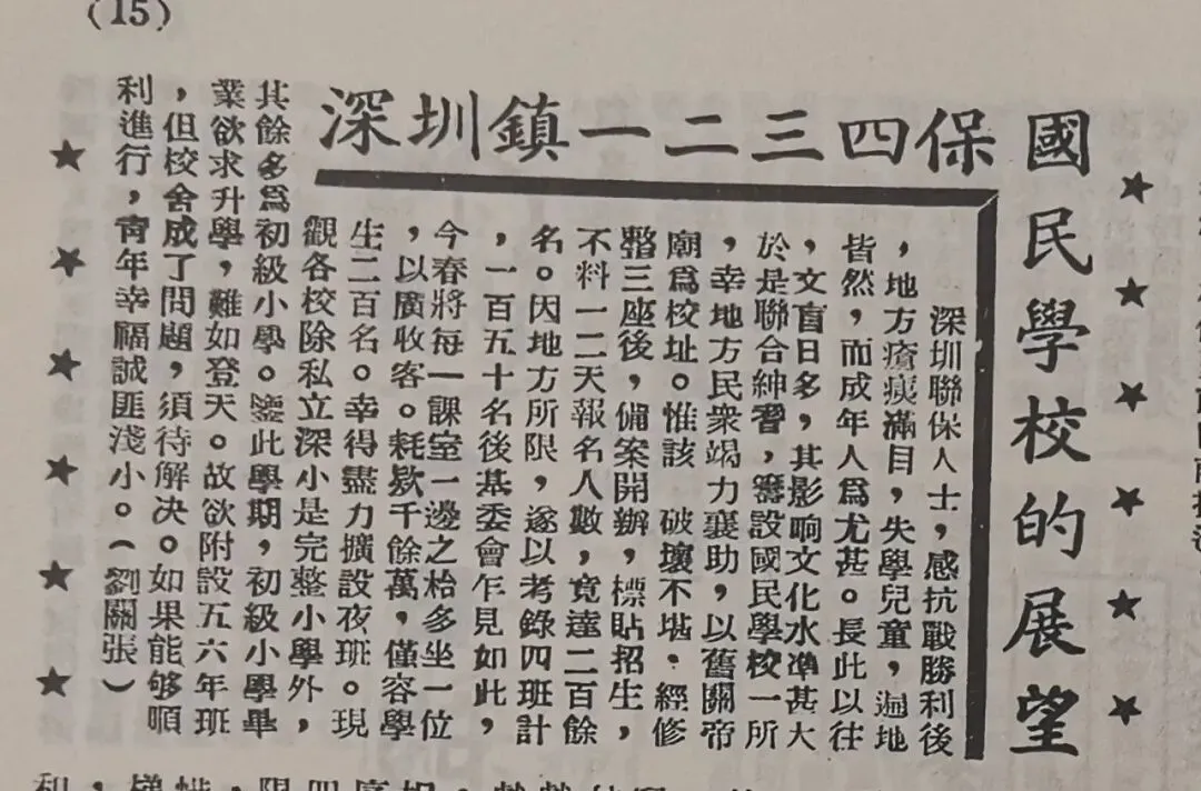 深圳一二三四保国民学校,又称“深圳联保国民学校”“深圳保国民学校”,后改称“深圳中心国民学校”。在深圳墟。(关于当时保甲编制,点击《