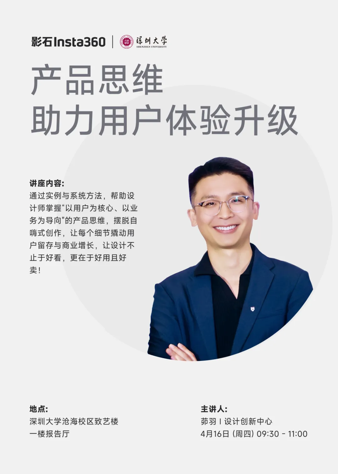 影石Insta360×深圳大学讲座来啦!本次讲座通过产品思维助力设计提升,实现“产品+设计”助力用户留存与增长。