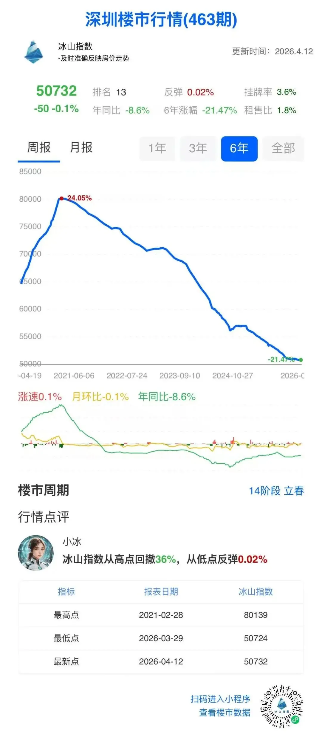 深圳楼市最新行情:冰山指数跌至50732,较2021年高点已大幅回撤36%,六年总涨幅为-21.47%,市场仍在深度调整。