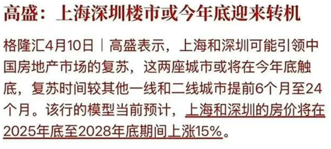 今天看到高盛发了1份报告:上海和深圳房价,将在2025年-2028年底间涨15%,复苏时间比其他一二线城市提前6-24个月。