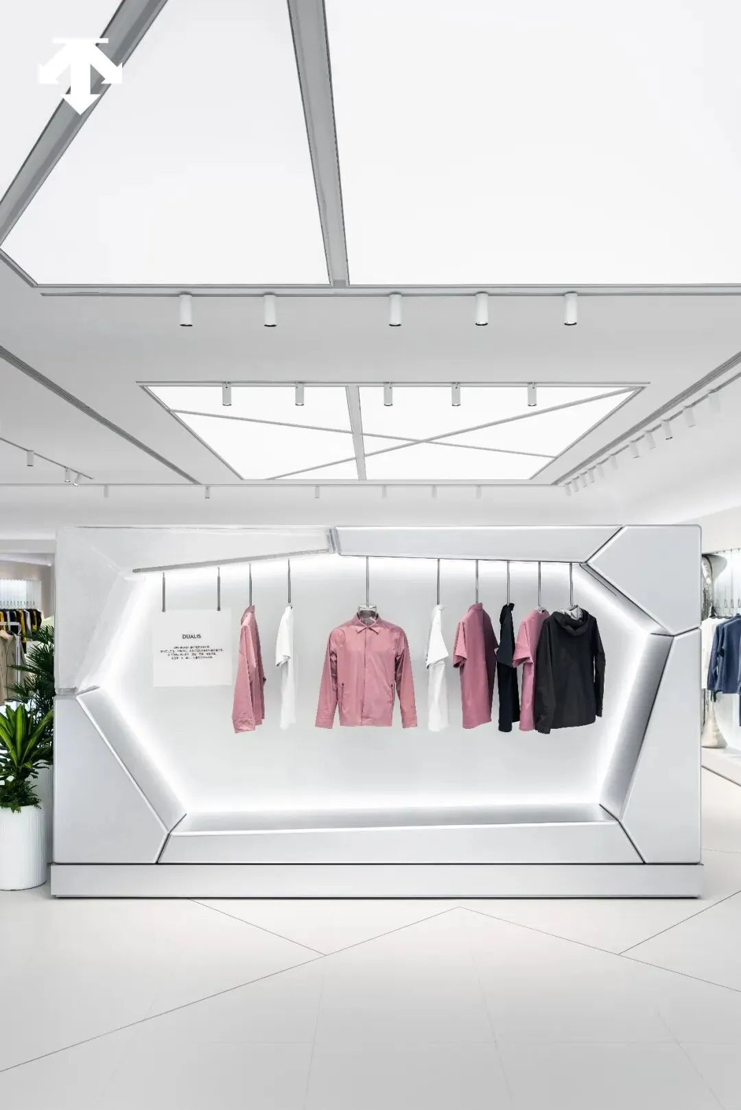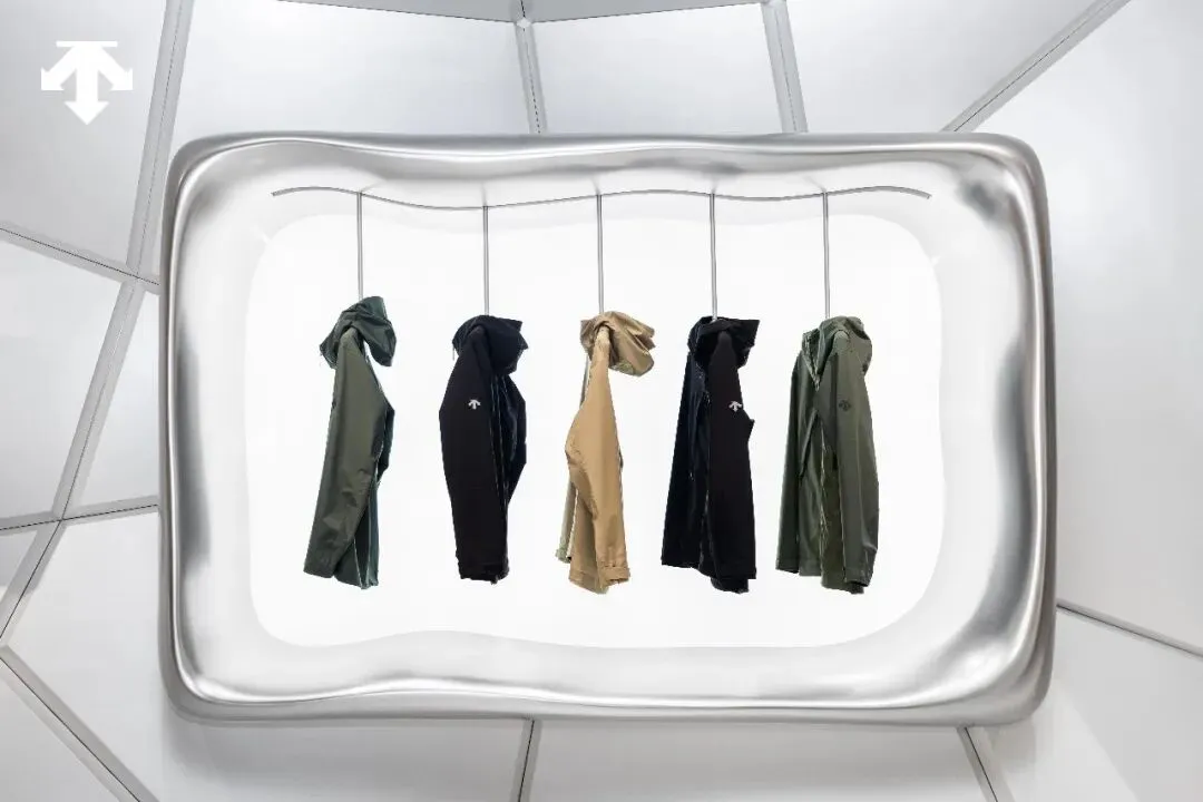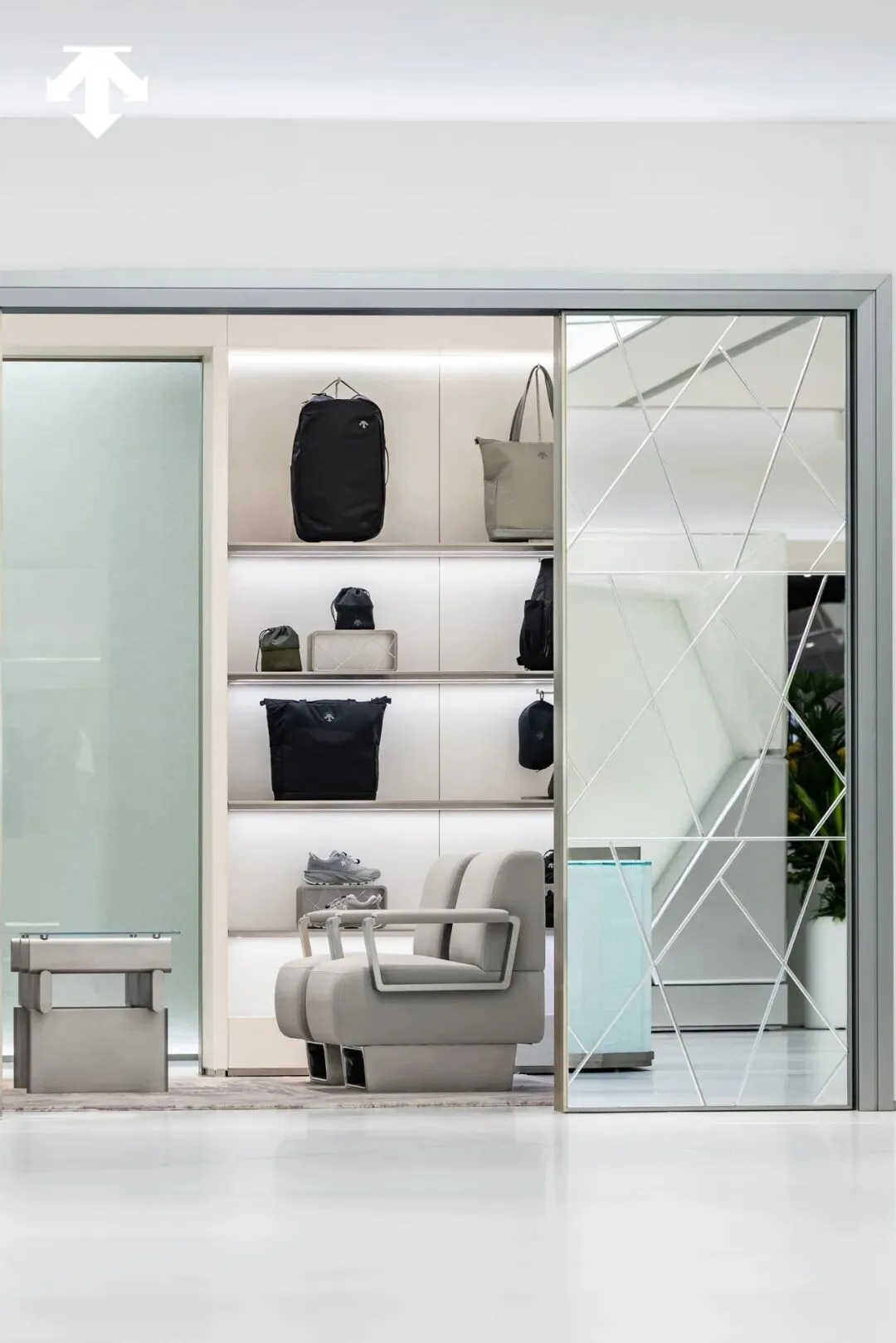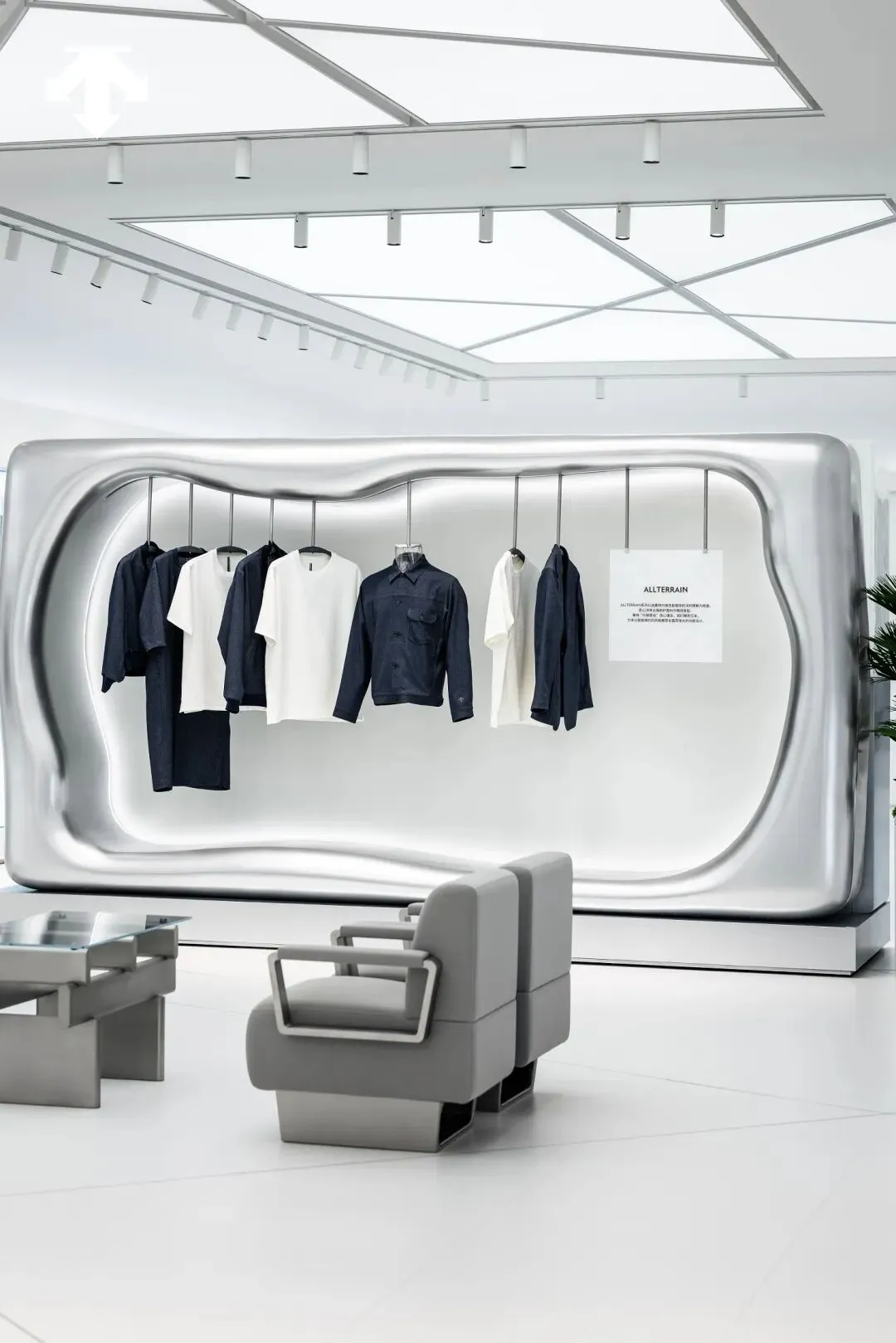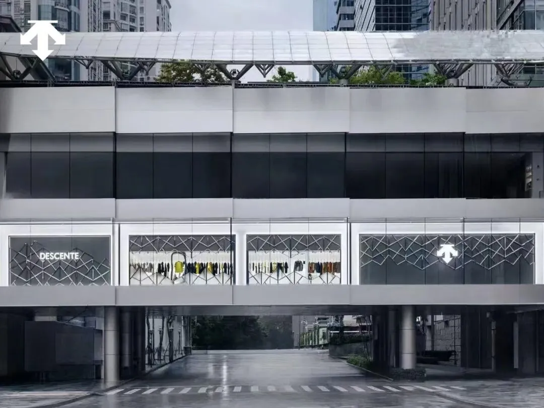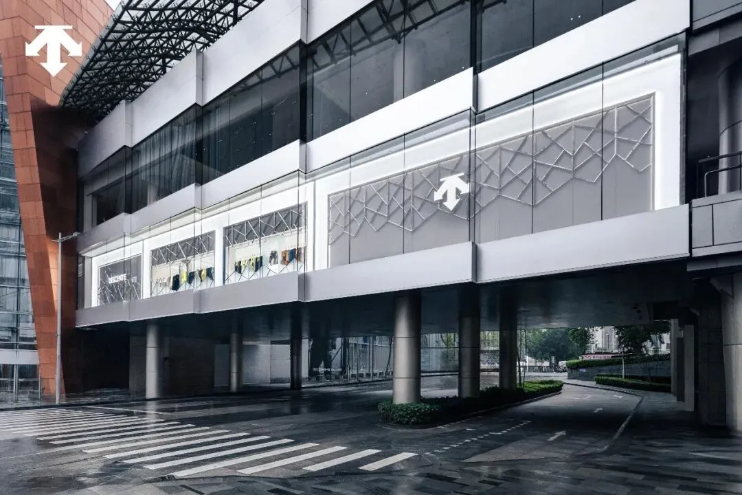 迪桑特一直卡在专业运动与高端生活方式之间的位置上。这家店的空间策略呼应了这一定位:氛围是冷静的、克制的、接近奢侈品的,但功能上依然服务于运动装备的陈列和试穿。