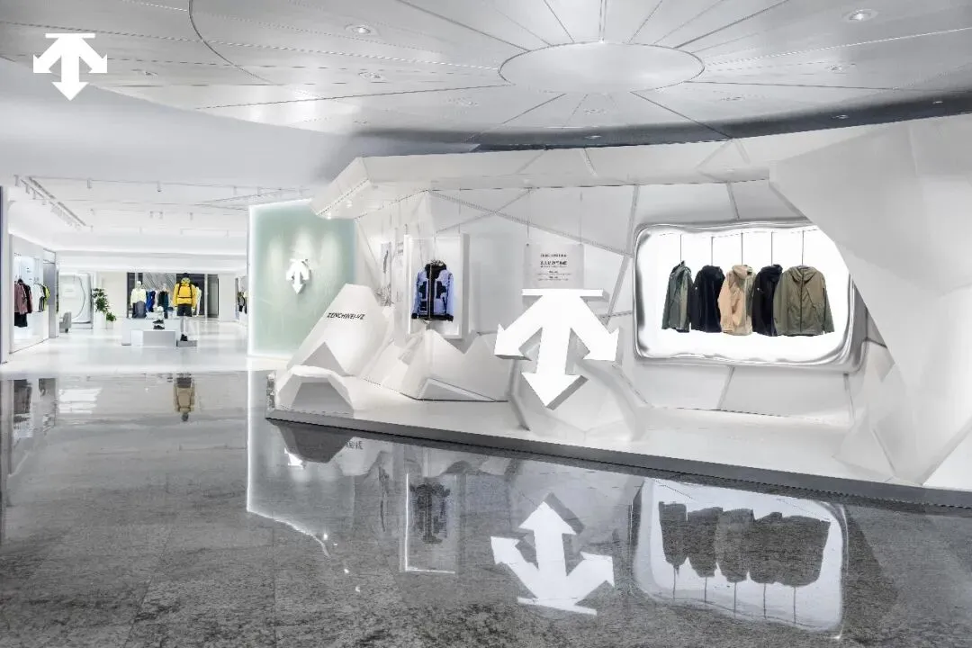 科技线条贯穿整个空间,既是功能照明,也是视觉线索。顾客顺着光的走向,自然完成动线转换。冰川意象在这里不是装饰主题,是空间结构的组织逻辑。