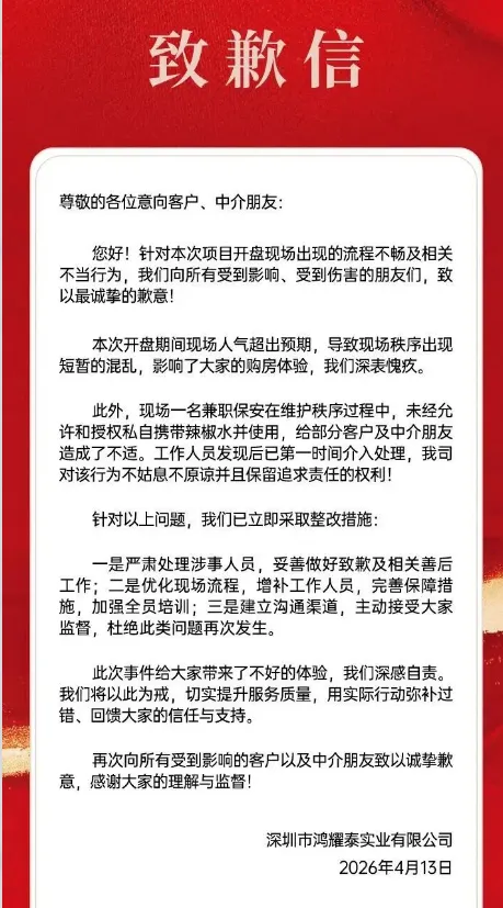 今天,一条 “深圳楼盘保安向排队购房者喷辣椒水” 的视频在网络上疯传,瞬间引爆舆论。视频中,一名身穿保安制服的男子,手持辣椒水,对着排队的购房者喷射,现场一片混乱,购房者纷纷四散躲避。官方随后通报,涉事保安已被行政拘留。这起看似偶然的事件,背后折射出的是楼市焦虑下的人性百态,以及房地产行业亟待解决的深层问题。今天,我们不站队、不指责,只聊聊这场发生在售楼处的闹剧,以及它背后值得我们深思的社会议题。一、现场直击:混乱的售楼处与失控的情绪
