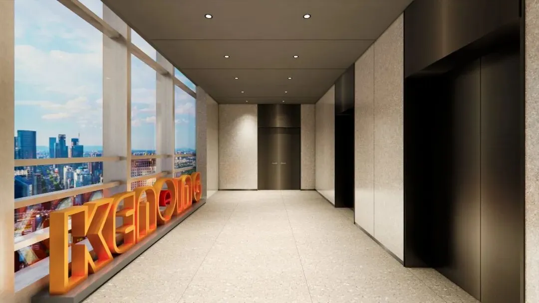 形象展示区:电梯厅以水磨石地面+金属电梯门传递稳重感,橙色立体字强化品牌记忆;大堂采用白色弧形灯带与科技感雕塑,契合智能科技企业定位。
