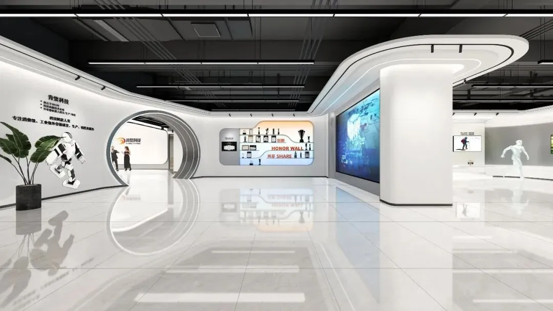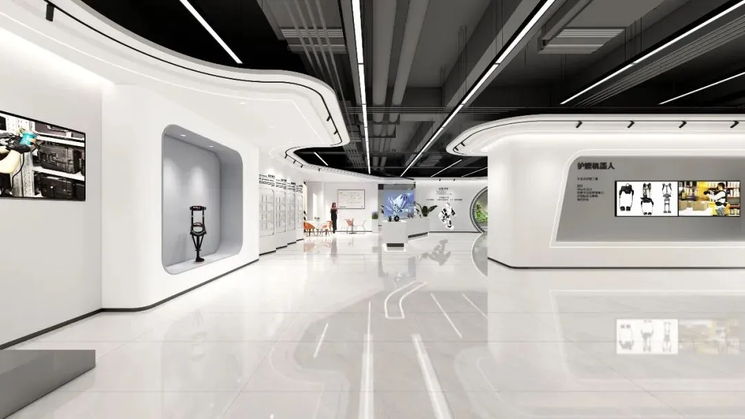 产品展厅:以黑白灰为主调,搭配曲线造型与线性灯,分区展示护腰机器人、行走助力机器人等核心产品,荣誉墙与大屏动态展示企业实力。