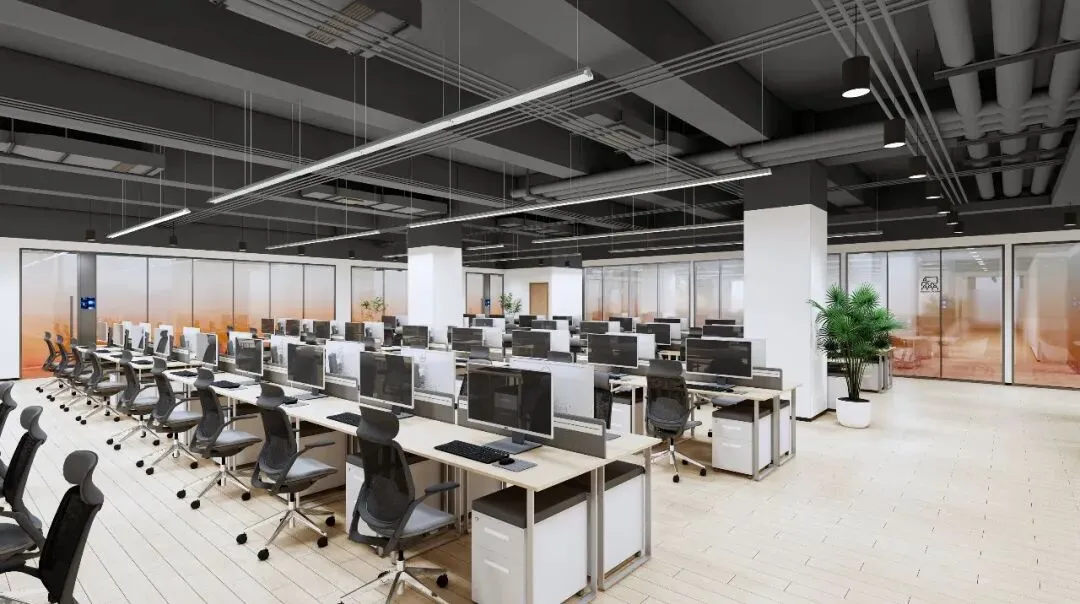 开放办公区:裸露顶面+线性灯凸显工业风,模块化工位与浅木色地面结合,高效适配研发协作需求。