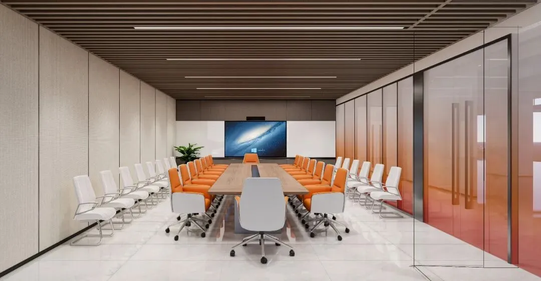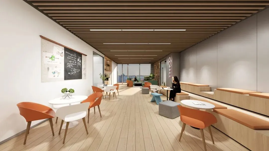 会议/休闲区:会议室以木格栅顶+橙白座椅营造活力氛围;休闲区采用木格栅顶与暖橙软装,打造舒适的交流休憩空间。