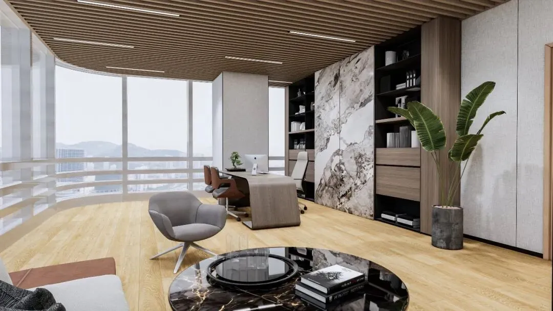高管办公室:弧形落地窗+木格栅顶,搭配大理石背景墙与浅木家具,兼顾商务质感与人文温度。
