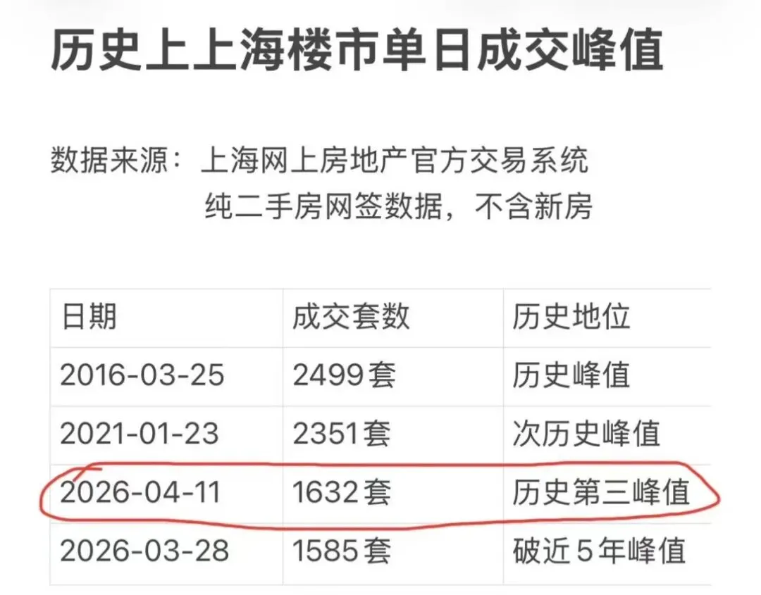 我们再来看上海的数据,从3月开始上海二手房大爆发,上个周六,一天成交1600多套二手房,是历史第三高峰。