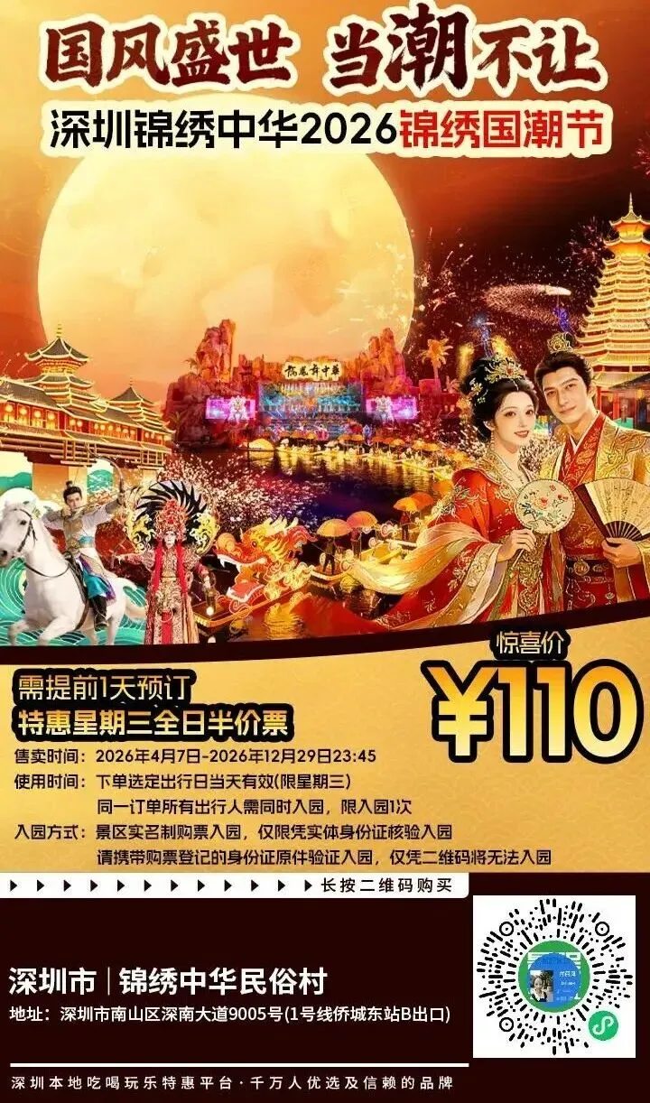 【费用包含】锦绣中华民俗文化村特惠星期三全日半价票1张(不包含景区内其他收费项目)