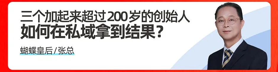 🔹 蝴蝶皇后张总:《三个加起来超过 200 岁的创始人如何在私域拿到结果》打破 “年龄限制” 误区,分享传统资深创始人转型私域的破局经验,证明选对方法就能出结果。