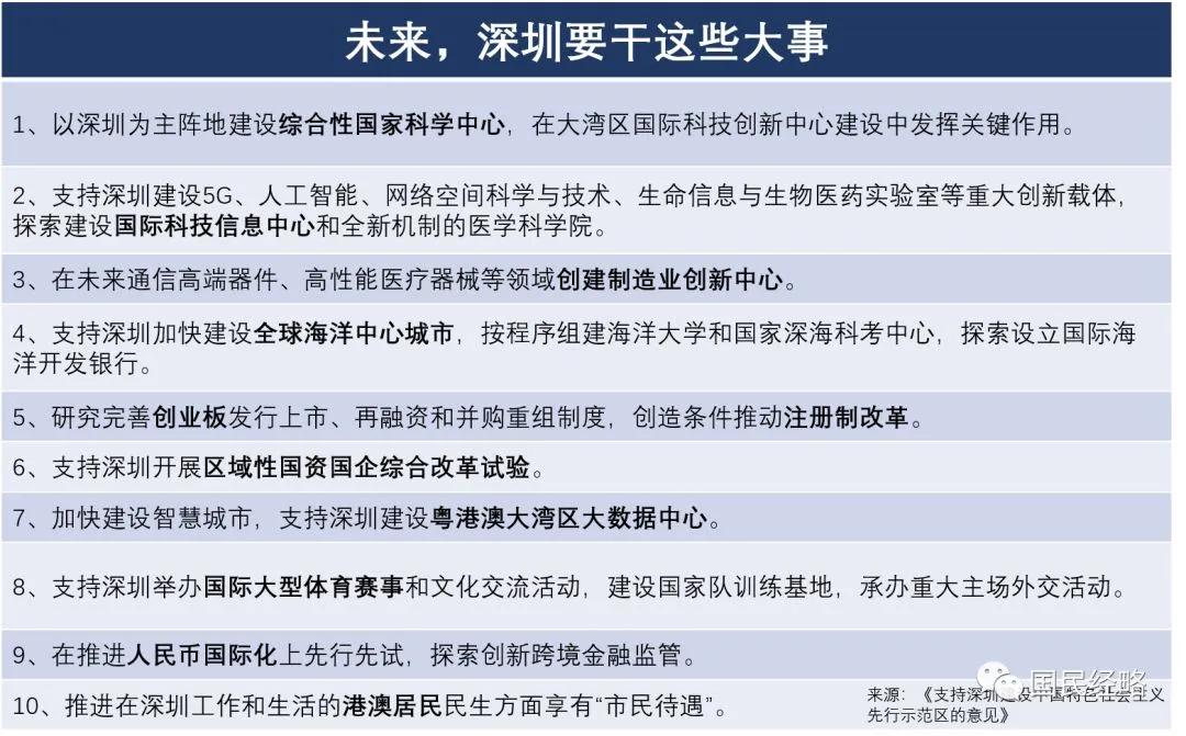 2025年,深圳经济实力、发展质量跻身全球城市前列,研发投入强度、产业创新能力世界一流,文化软实力大幅提升,公共服务水平和生态环境质量达到国际先进水平,建成现代化国际化创新型城市。 2035年,深圳高质量发展成为全国典范,城市综合经济竞争力世界领先,建成具有全球影响力的创新创业创意之都,成为我国建设社会主义现代化强国的城市范例。 2050年,深圳以更加昂扬的姿态屹立于世界先进城市之林,成为竞争力、创新力、影响力卓著的全球标杆城市。