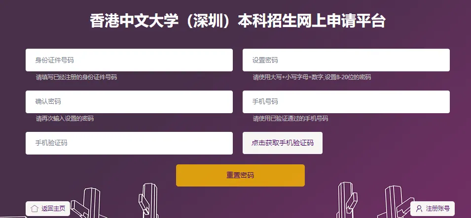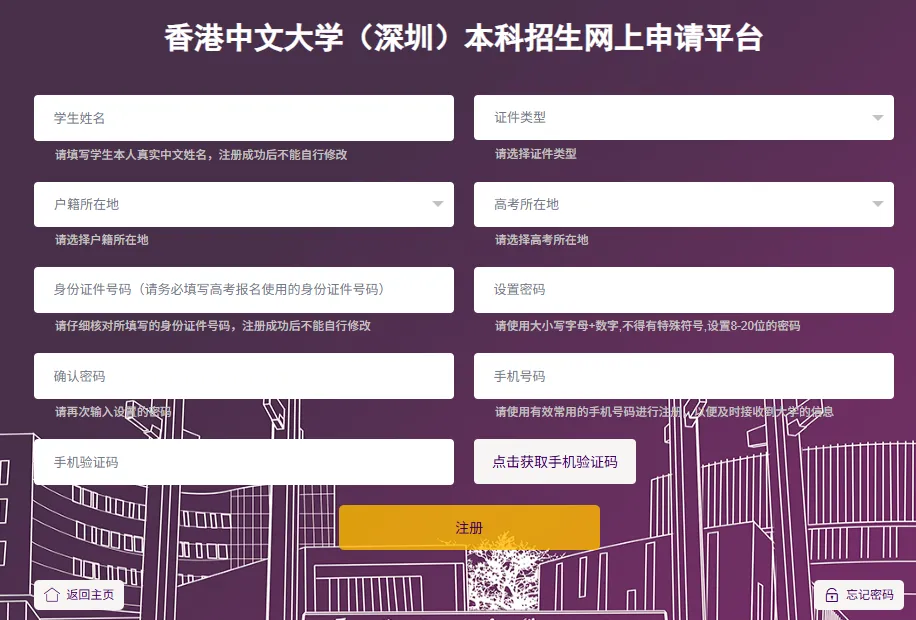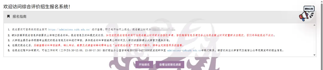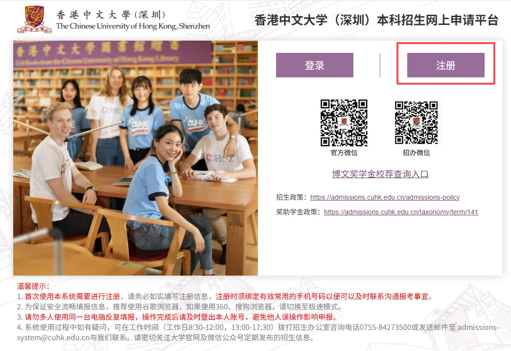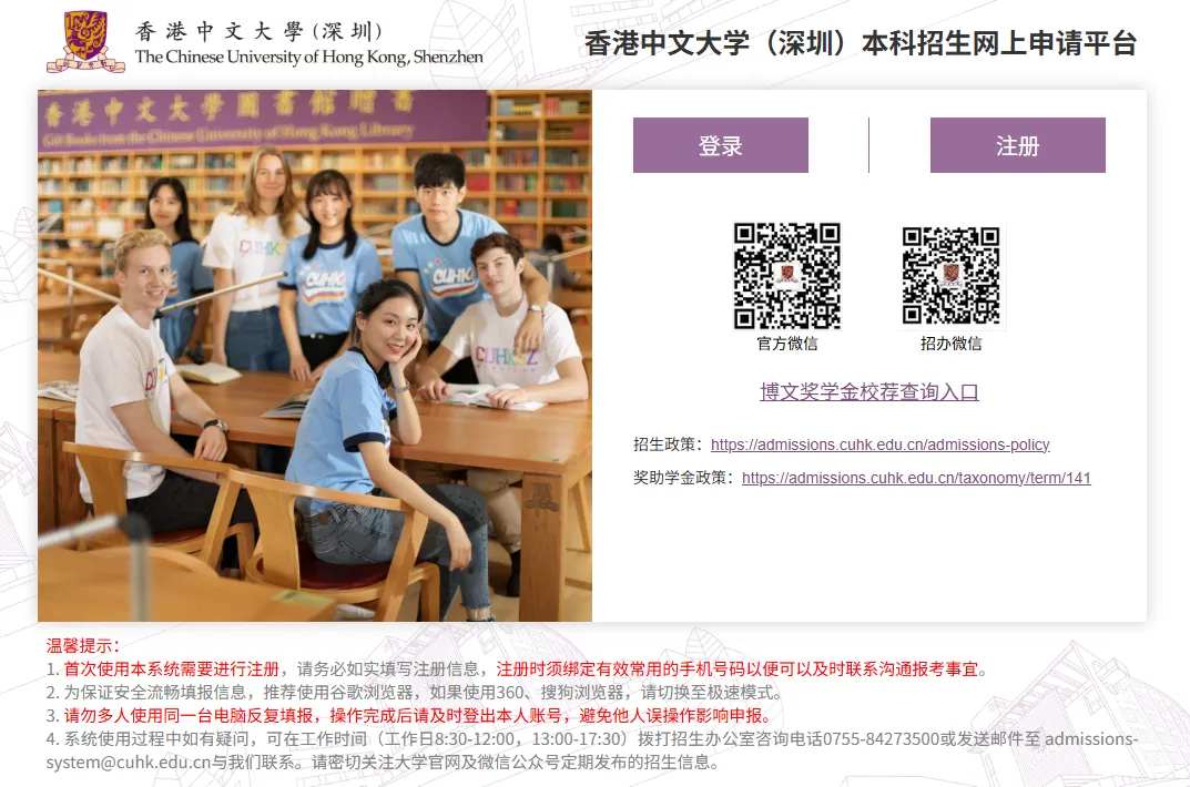 首次使用本系统需要进行注册,点击“注册”,按要求如实填写注册信息,注册时须绑定有效常用的手机号码。为保证安全流畅填报信息,推荐使用谷歌浏览器,如果使用360、搜狗浏览器,请切换至极速模式。系统使用过程中如有疑问,可在工作时间(工作日8:30-12:00,13:00-17:30)拨打招生办公室咨询电话0755-84273500或发送邮件至 admissions-system@cuhk.edu.cn 与我们联系。请密切关注大学官网及微信公众号定期发布的招生信息。