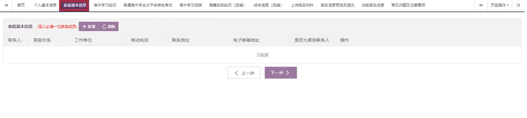 该项为选填项,如没有该信息可跳过不填写。点击“新增”进行填写,填写完成后,点击“保存”按钮,保存已填写的信息;点击“下一步”按钮,继续填写信息。