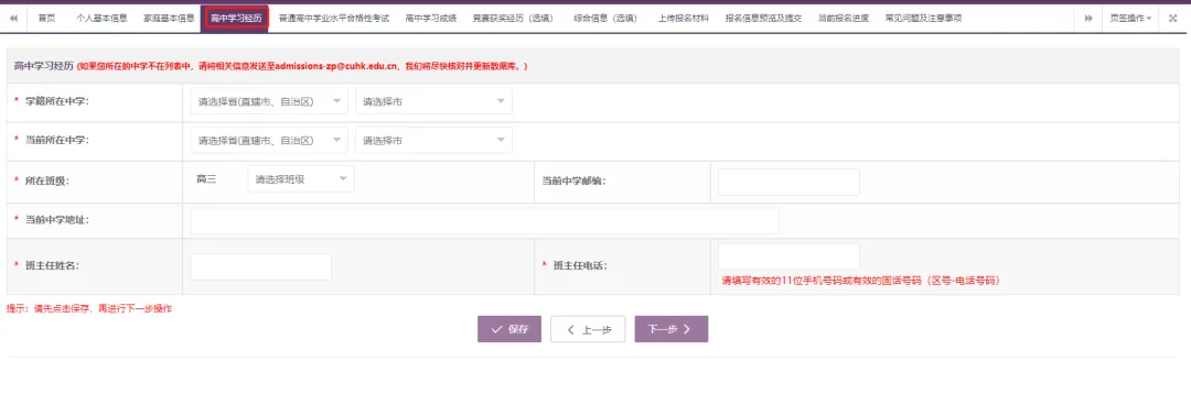 标*为必填项,填写完成后,点击“保存”按钮,保存已填写的信息;点击“下一步”按钮,继续填写信息。如果所在中学不在列表中,请将相关信息发送至 admissions-zp@cuhk.edu.cn ,系统后台将尽快核对并更新数据库。