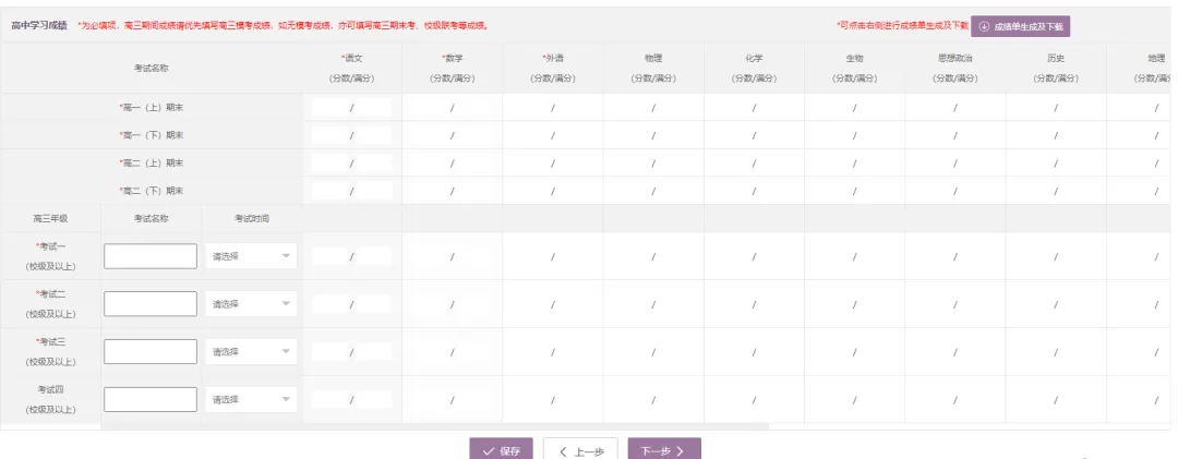 标*为必填项,填写完成后,点击“保存”按钮,保存已填写的信息并可在右上角下载已填写完成的成绩单进行盖章;点击“下一步”按钮,继续填写信息。请仔细阅读上方的填写注意事项。