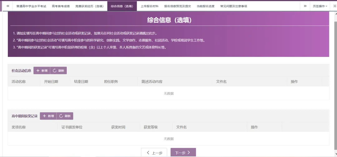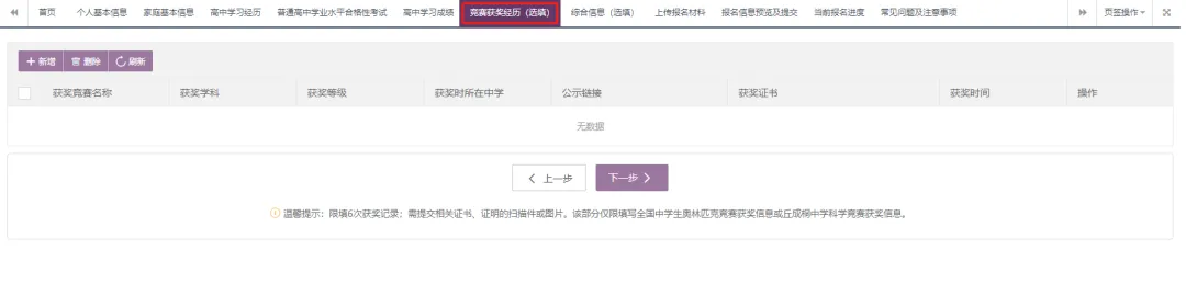 该项为选填项,如没有该信息可跳过不填写。点击“新增”进行填写,填写完成后,点击“保存”按钮,保存已填写的信息;点击“下一步”按钮,继续填写信息。温馨提示:限填6次获奖记录;需提交相关证书、证明的扫描件或图片。该部分仅限填写全国中学生奥林匹克竞赛获奖信息或丘成桐中学科学竞赛获奖信息。