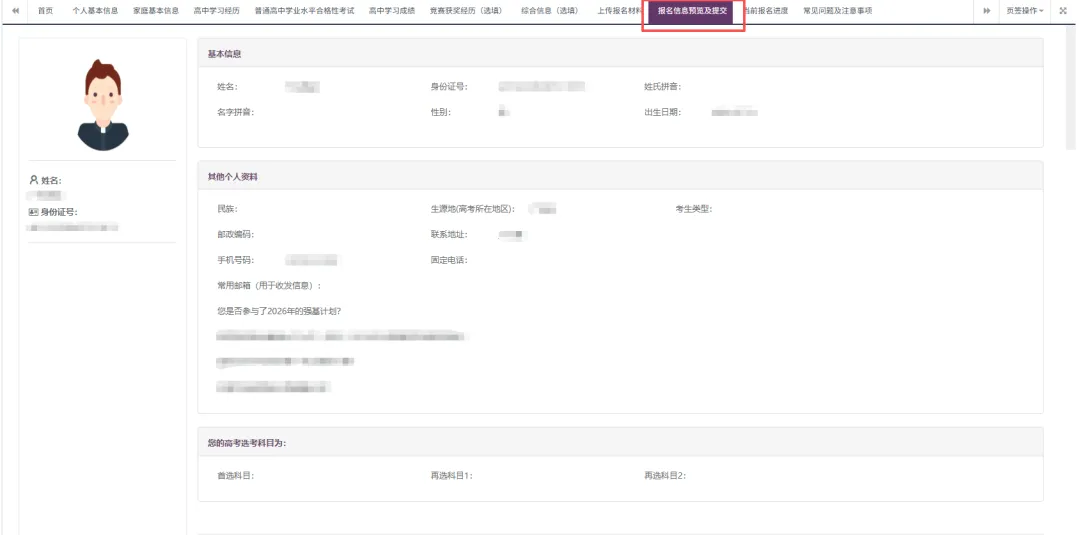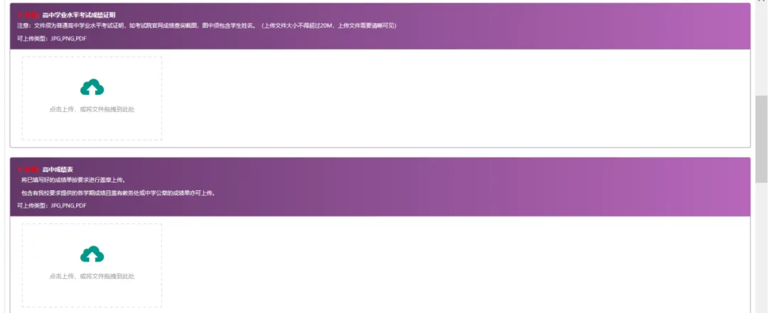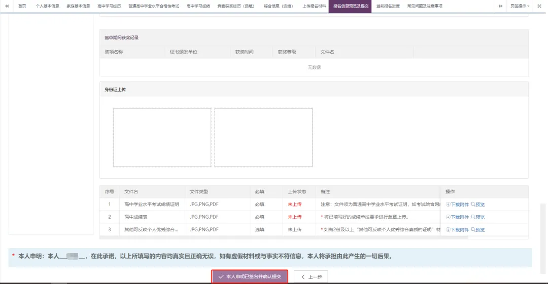 标*为必填项,按照要求上传身份证件以及其他对应文件,上传完成后,点击“下一步”按钮,查看报名信息预览。上海考生无须提供普通学业水平合格性考试成绩单。温馨提醒:高中成绩单上传建议使用我校成绩单模板但不强制使用,包含有我校要求提供的各学期成绩且盖有教务处或中学公章的成绩单亦可上传。