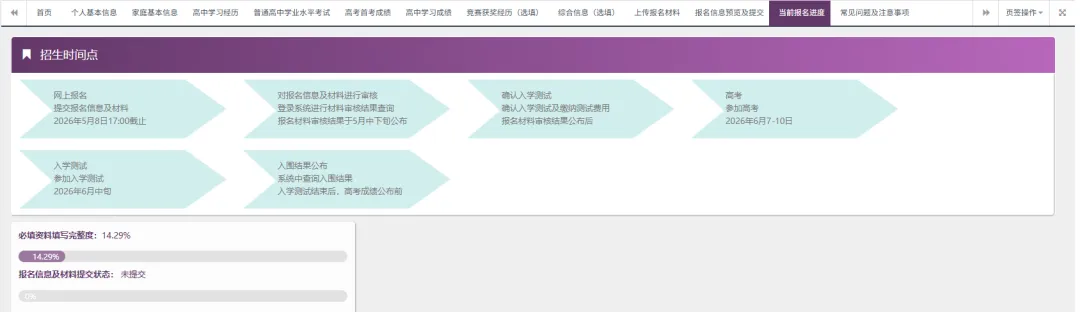 在提交申请之后,您可在综合评价招生报名系统的当前报名进度中查询当前状态及进行后续操作,包括查询提交状态、查询材料审核结果、考试确认、缴费、查询考试成绩及入围情况等。