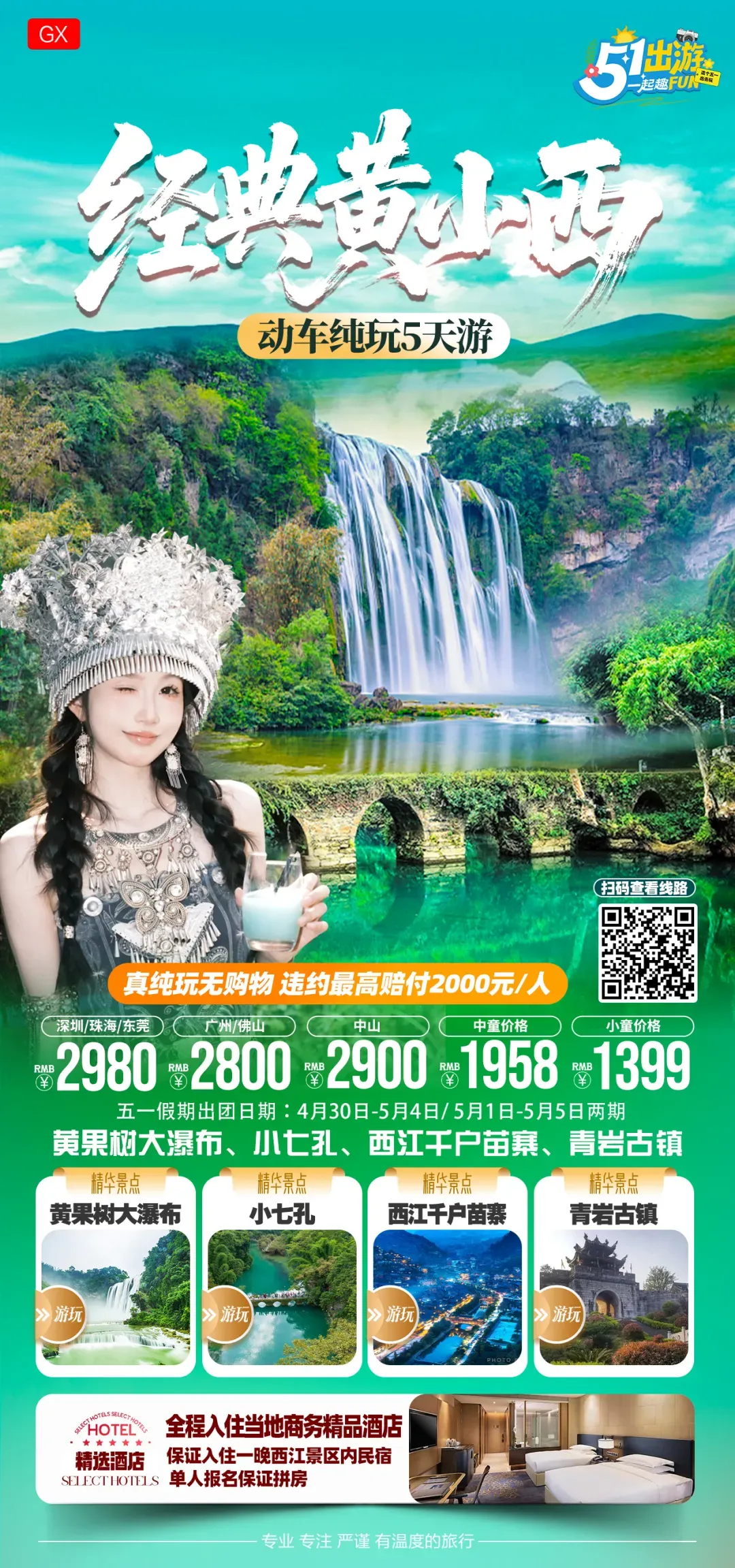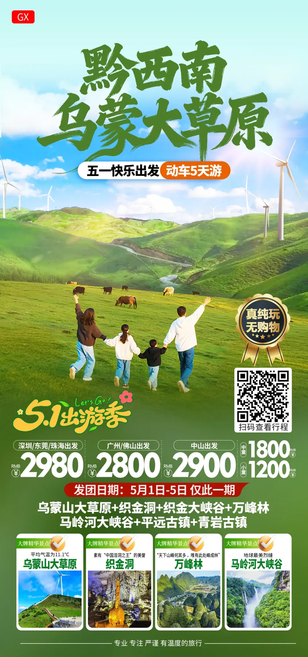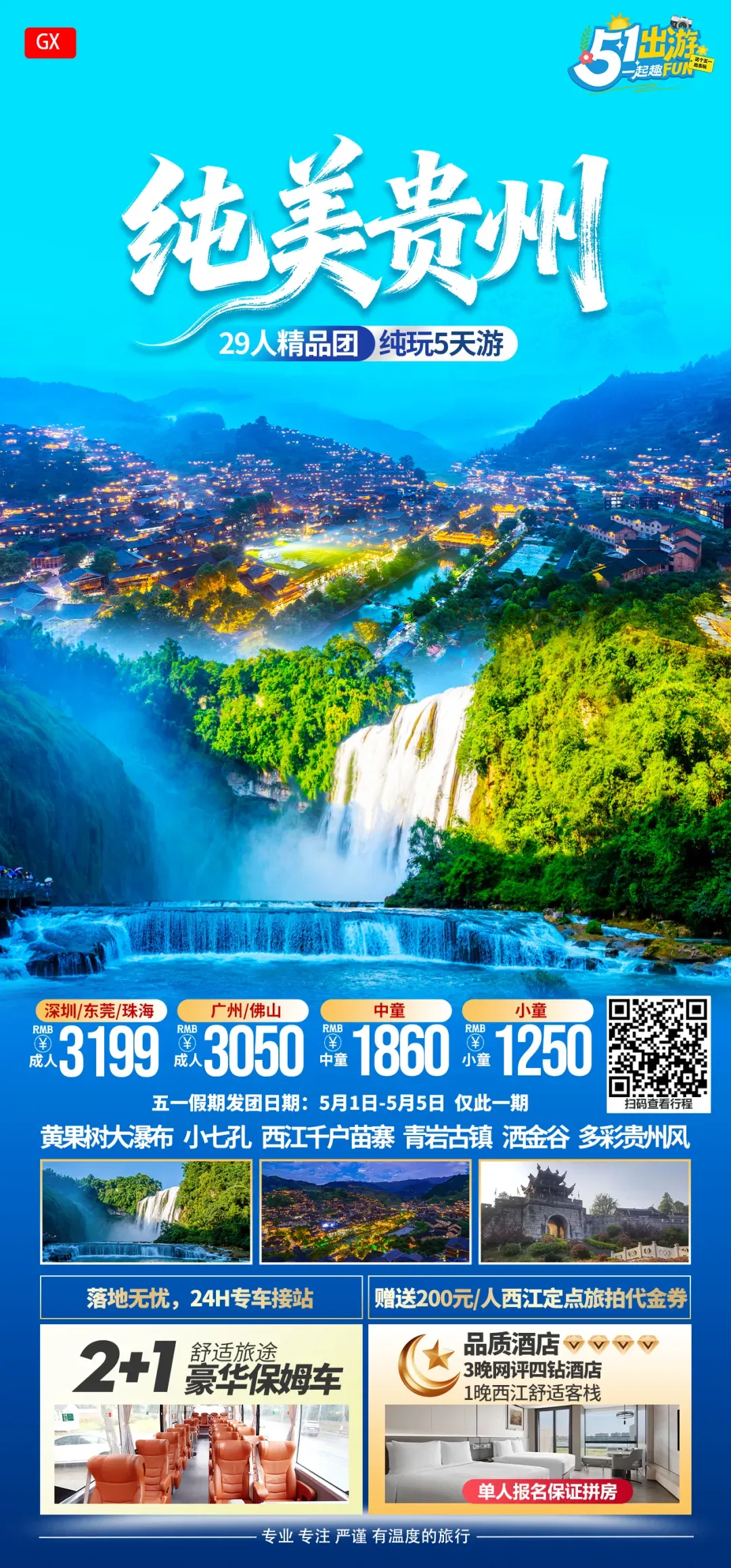 五一深圳出发贵州全景跟团游,高铁往返纯玩无购物,畅游中国天眼、万峰林、乌蒙大草原、黄果树、小七孔与西江苗寨,天文奇观、喀斯特山水