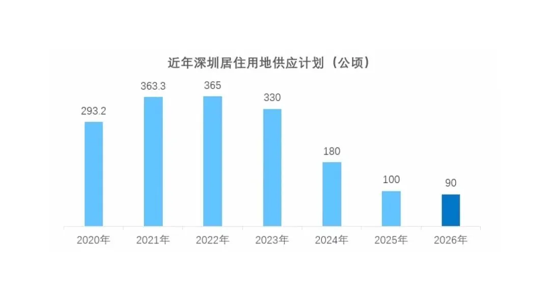 真正的断崖式收缩,从2024年正式拉开序幕。2024年深圳居住用地供应计划直接腰斩到180公顷,较2023年的规模缩水接近一半;2025年这个数字进一步下探到100公顷,到2026年,计划供应规模已经降到了90公顷。