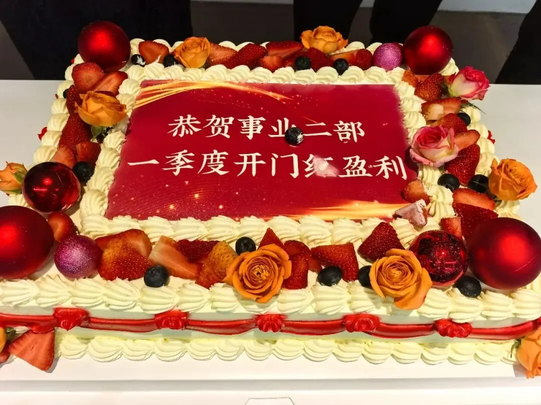 过去三个月,事业二部在全体同事的共同努力下实现了一季度盈利。会议特别设置了一季度盈利庆功仪式,黄总与各位总监、经理们共同上台,开启庆功蛋糕,这份荣誉属于每一位在一线冲锋、在后端坚守的中原人。