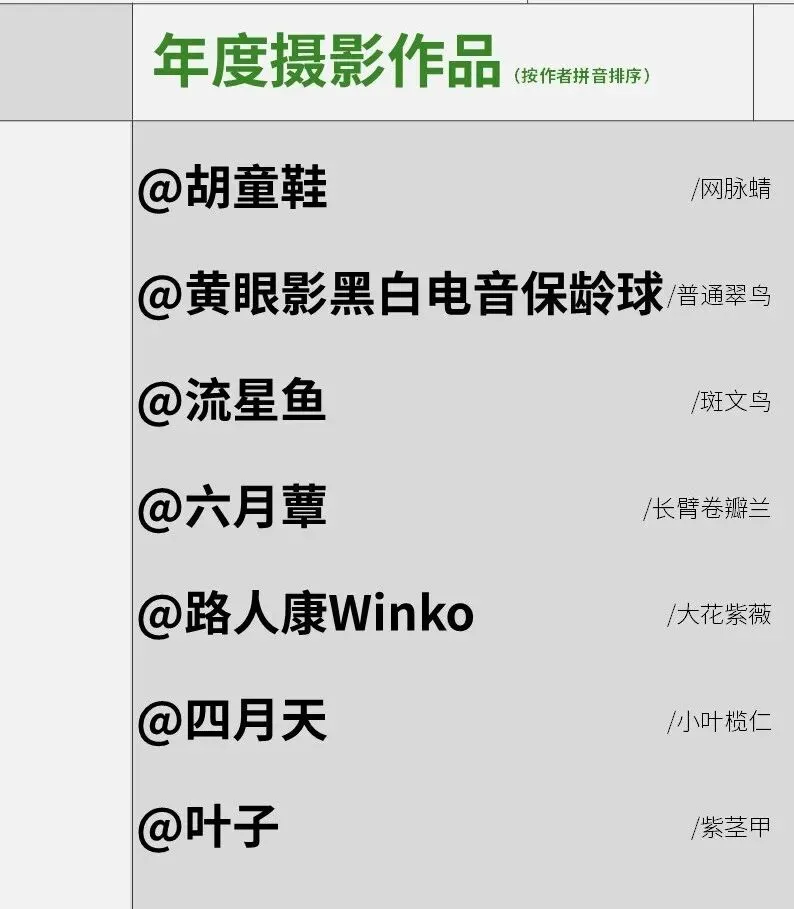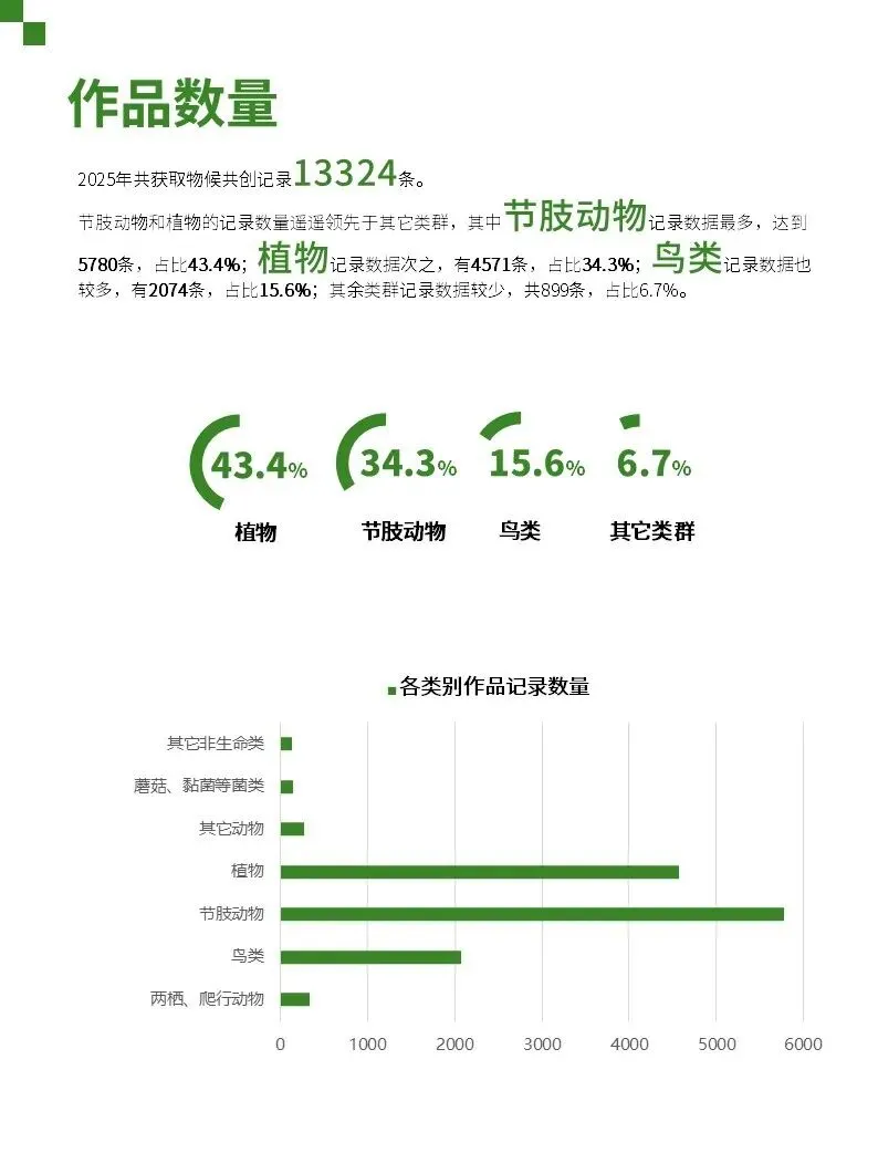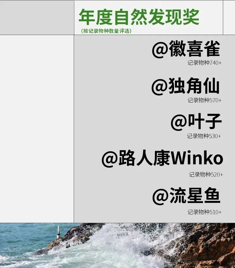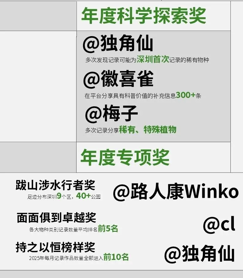 为感谢和鼓励物候项目的参与者,根据2025年上传的作品数量、物种数量、记录地点分布、科普艺术价值等,评选了年度数据贡献奖、年度自然发现奖、年度专项奖等多个奖项。