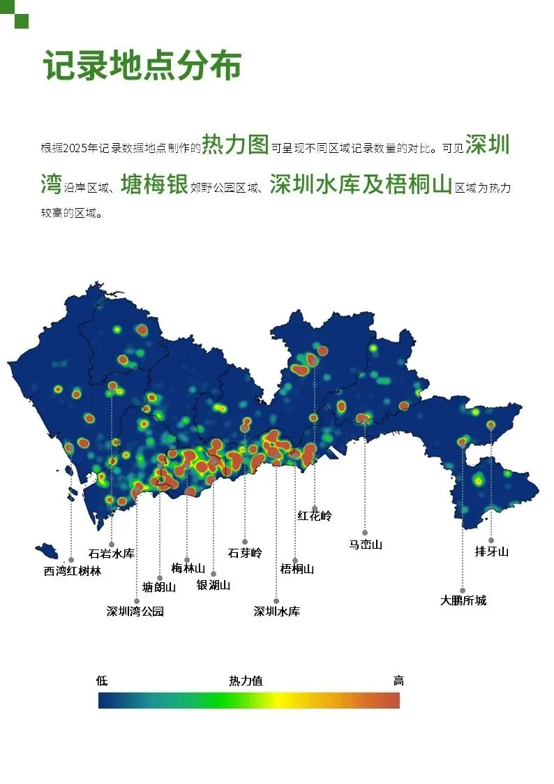 我们基于每张图片的位置信息,通过地理信息系统的分析,生成了地点分布的热力图,识别了如深圳湾沿岸区域、塘梅银郊野公园区域、深圳水库及梧桐山区域等深受自然爱好者青睐的观察地点。