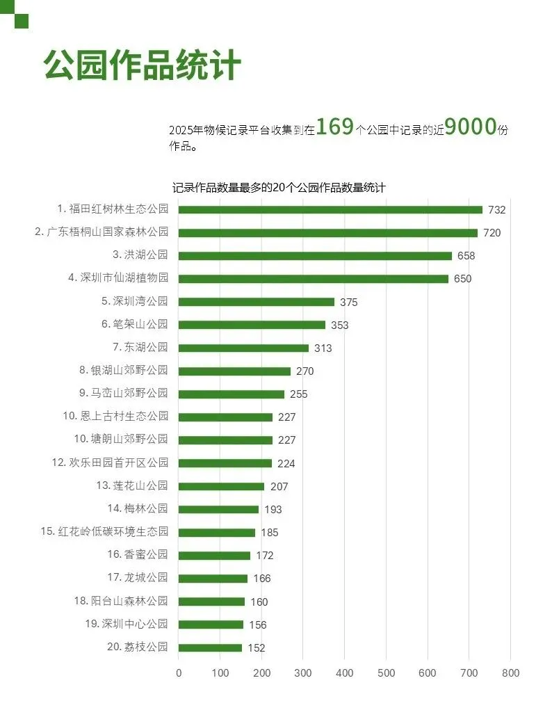 在2025年度的一万多条记录当中,有超过六成的记录地点是在深圳的公园内,分布在161个公园,共计九千多份上传记录。我们对所有公园收集的数据进行了统计,得出了市民最关注、或者说最适合自然观察的公园排名前二十位。