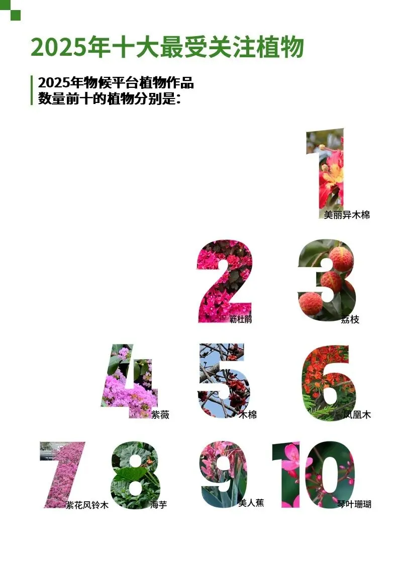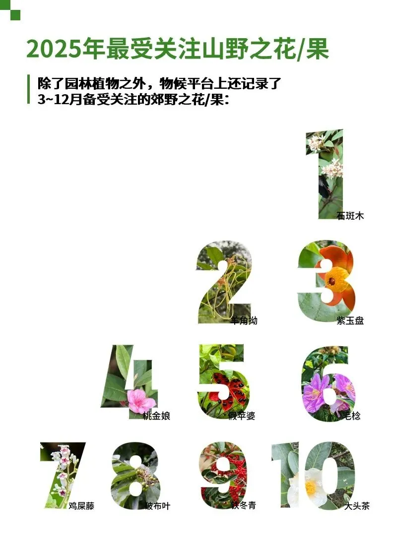 基于2025全年物候记录平台数据,我们分别统计出了最受关注植物、虫虫、鸟类、两爬及其他生物榜单,这些榜单在一定程度上反应出市民对不同物种关注度的偏好。