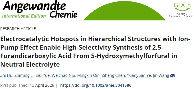 2026年4月13日,深圳大学王进在Angewandte Chemie International Edition发表了题为"Electrocatalytic Hotspots in Hierarchical Structures with Ion-Pump Effect Enable High-Selectivity Synthesis of 2,5-Furandicarboxylic Acid From 5-Hydroxymethylfurfural in Neutral Electrolyte"的研究论文,Zhi Hu为论文第一作者,王进为论文通讯作者。