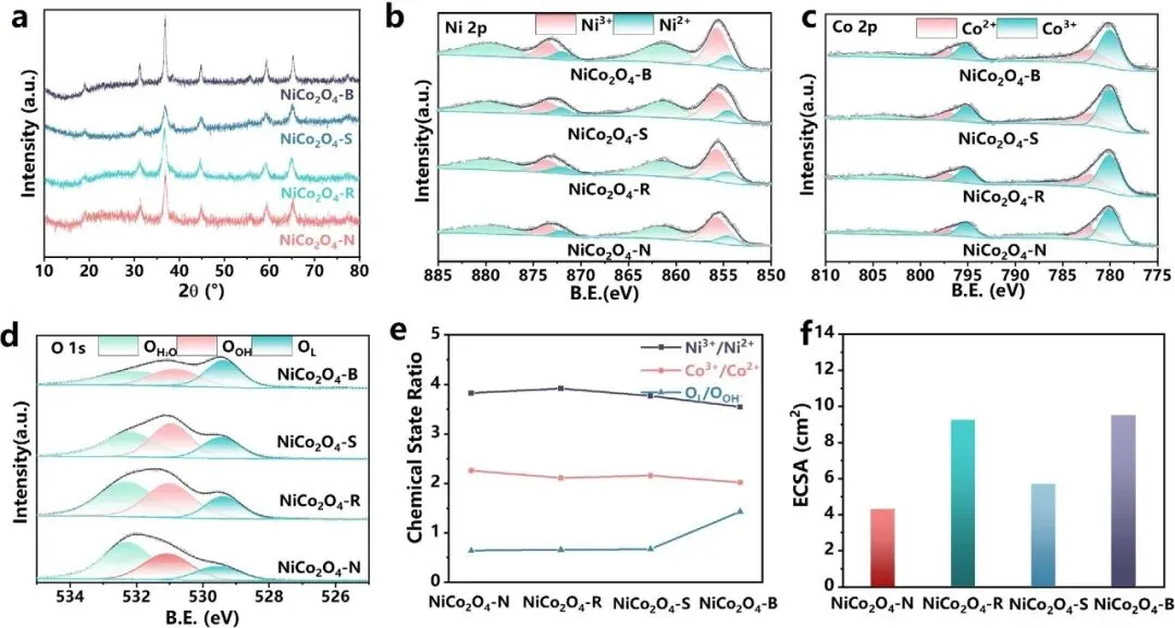 图2 | 不同形貌NiCo₂O₄催化剂的XRD图谱、XPS光谱及电化学活性表面积比较