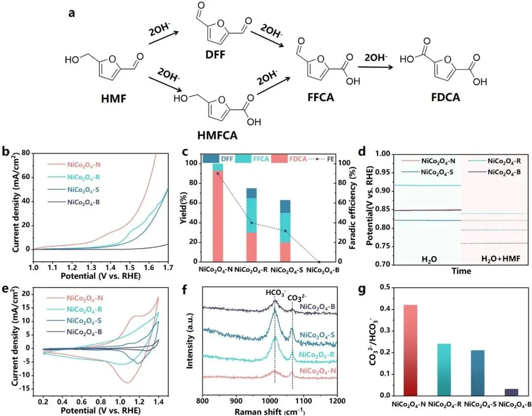 CV测试显示针状催化剂具有最强的OH⁻吸附能力,Raman光谱证实其表面CO₃²⁻/HCO₃⁻比例最高,表明表面OH⁻浓度显著富集,这与其优异的FDCA选择性直接相关。