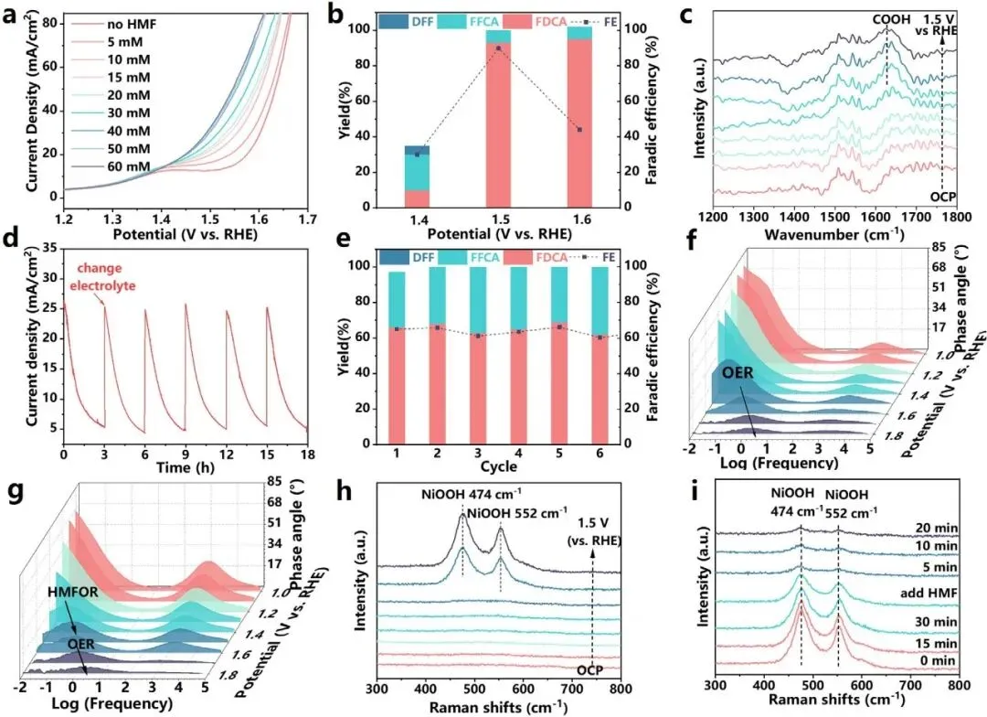 原位Raman在1.4 V出现Ni³⁺-O键特征峰(474 cm⁻¹和555 cm⁻¹),证实NiOOH形成;加入HMF后该峰迅速减弱,证明NiOOH直接参与HMF氧化。原位IR在1630 cm⁻¹出现羧基特征峰,进一步验证FDCA生成。