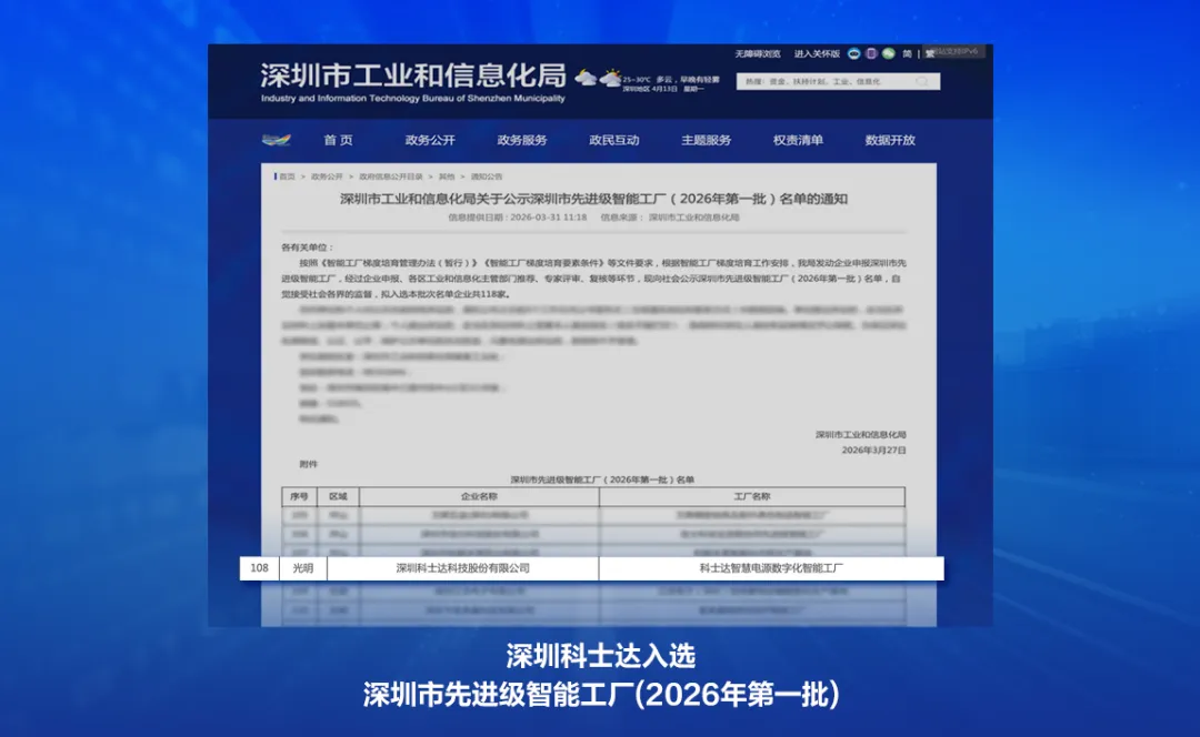 近日,深圳市工业和信息化局公布2026年第一批深圳市先进级智能工厂名单,科士达凭借“智慧电源数字化智能工厂”成功入选。这是继获得国家智能制造成熟度三级认证后,科士达在智能制造领域的又一重要突破。