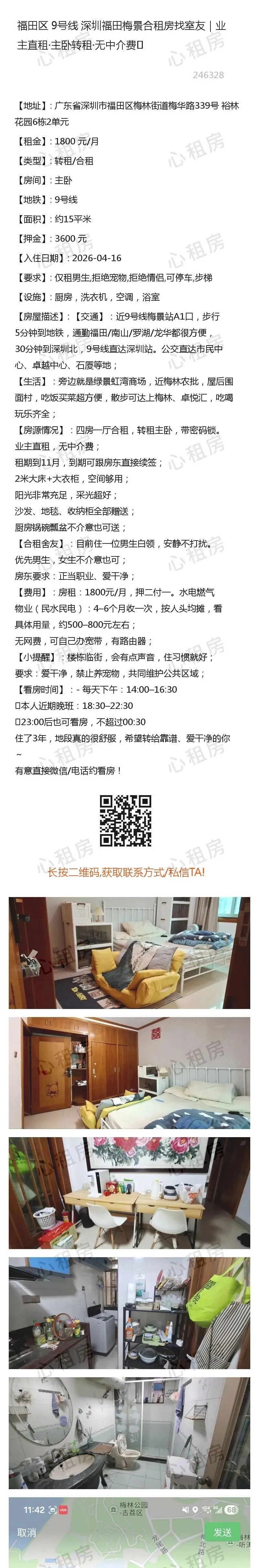 深圳租房>>福田区9号线深圳福田梅景合租房找室友|业主直租·主卧转租·无中介费✨1800元/月