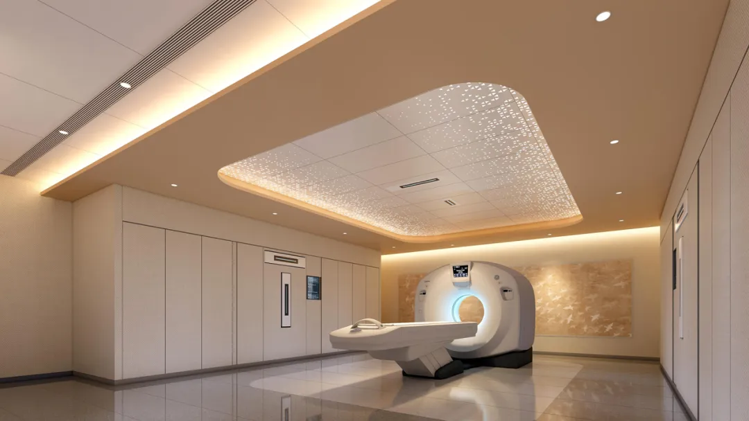 放疗影像空间则实现了自然与科技、人文与疗愈的交融。空间以生命自然波形与科学探测技术为灵感,借由丰富植物肌理与材质表达,既为患者提供放松的检查氛围,又传递出高端专业空间的信任感。