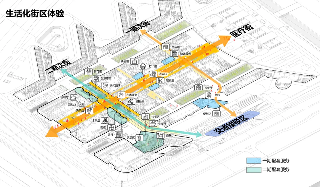 在一二期衔接处,一场“街区迭代”意义深远。一期简单的空间轴线,升级为活力多元的服务街区,美食广场、特色商业与便利服务一应俱全,形成了从生活必需品到休闲购物的完整服务生态。