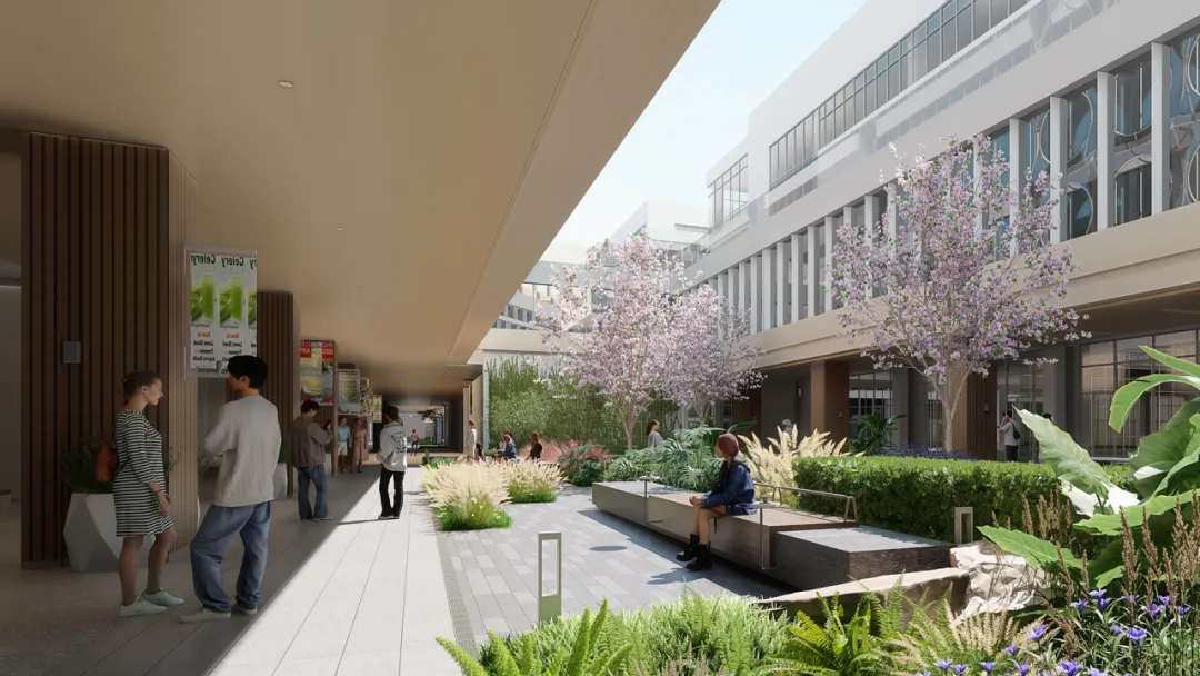 一条光线充足的室内“医疗街”,串联起两侧的便利店、书店、咖啡馆,以及小型餐厅与儿童游戏角等休闲配套,成为可以驻足、偶遇、产生短暂交流的生活街区。