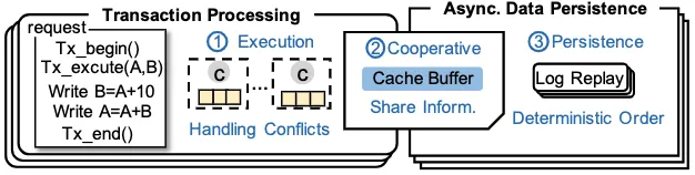 为此,团队提出一种复用并发控制保证有序写入的持久化事务内存系统。该系统的核心思想是:利用事务执行时建立的可序列化顺序,来确定性地引导异步数据持久化过程,从而避免了昂贵的协调排序开销。为了实现该机制,团队设计了一个轻量级协调事务框架。