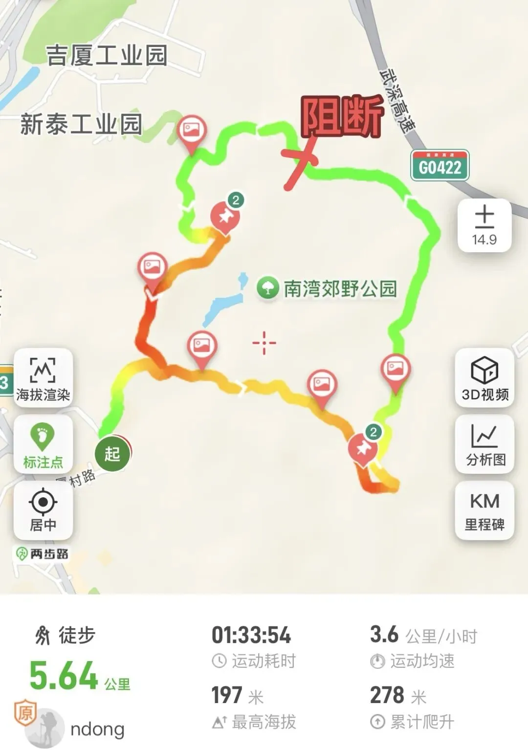 外围环线:从两步路轨迹看,沙湾郊野公园有5km环线步道,但目前因为施工,游客中心附近的路段被阻断,无法走环线了。