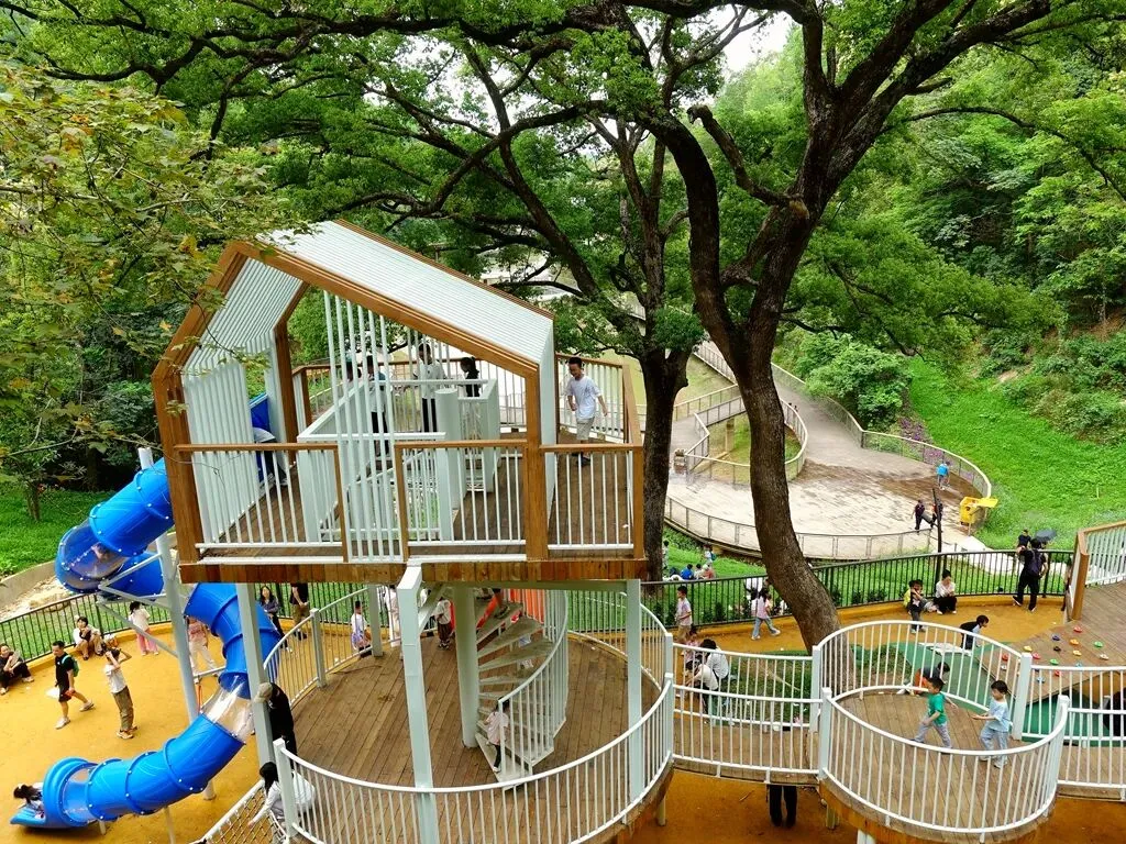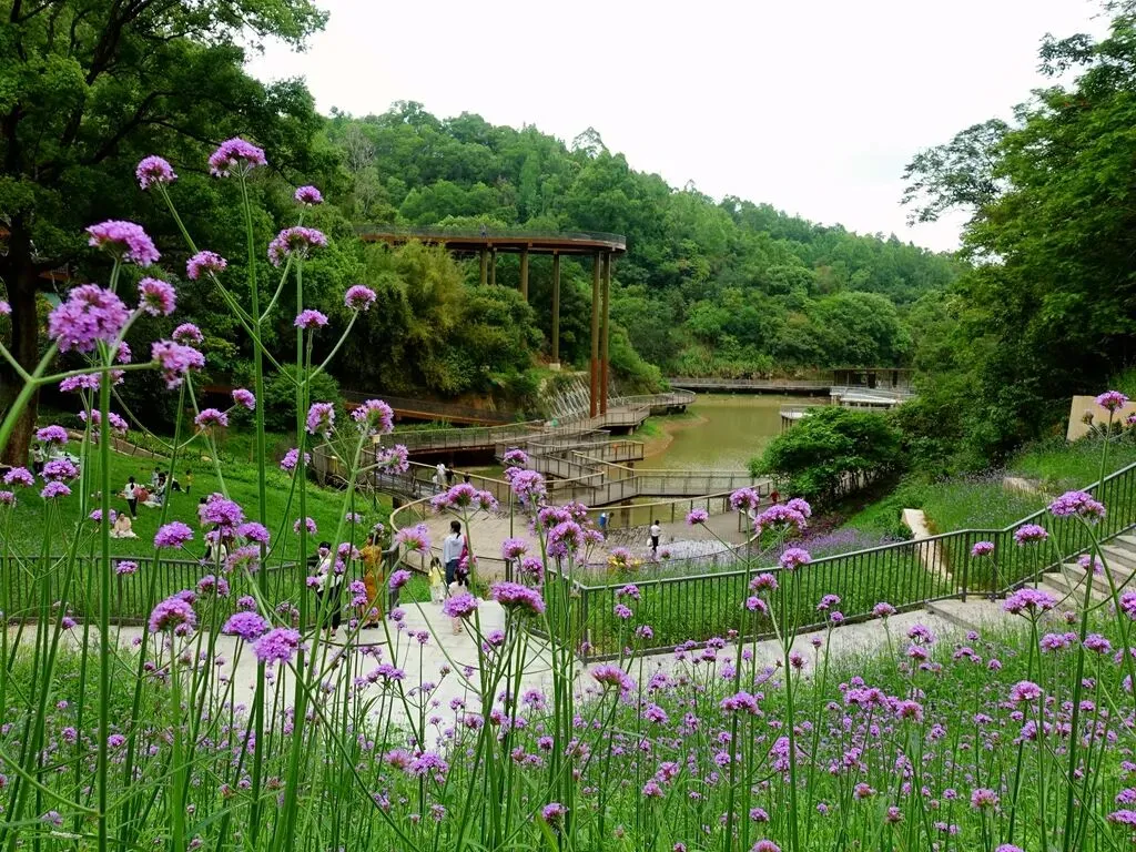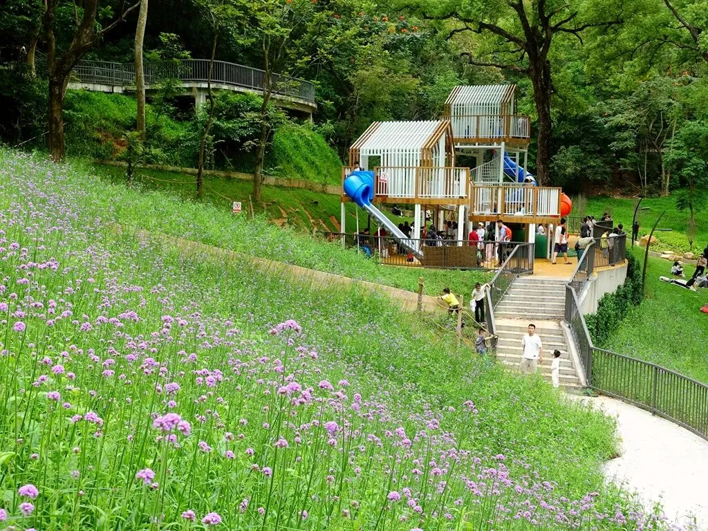 真实风景:悬空廊桥目前未开放,从高处可以拍摄,但无法走上去体验。儿童游乐设施并不多,可以参考下面的图片。大树底下草坪休闲挺舒服的,山坡上种了很多紫色马鞭草。风景没有那么特别,不要被某些宣传文章勾引,也不要抱着太高期待。